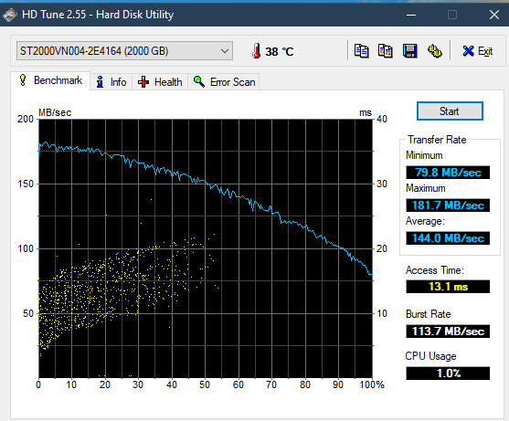 Benchmark vypadá dobře na propady, rychlost i access time. Burst Rate se mi zdá hodně malý, ale zase nevím co to konkrétně ovlivňuje a nenašel jsem porovnatelný screen na netu.