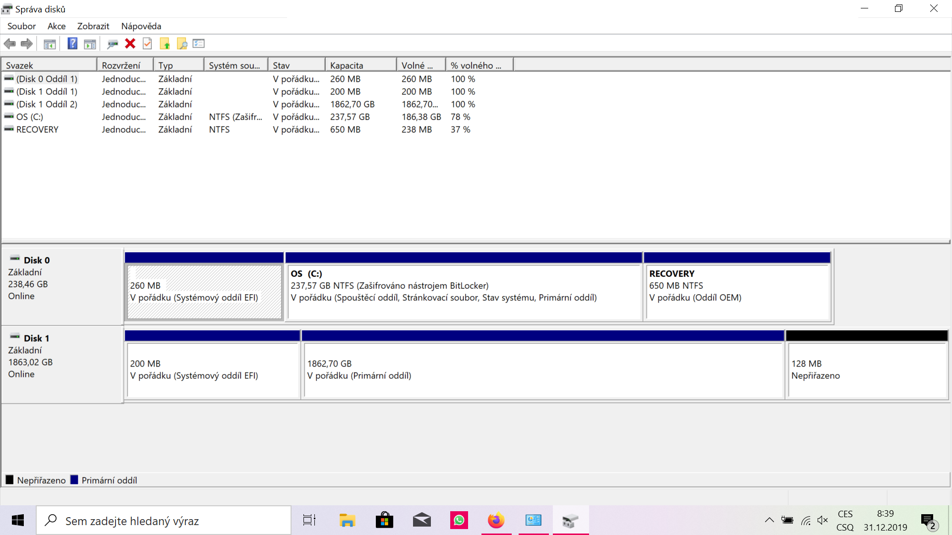 co v té správě disků, tam není vidět taky nic? Jako že by nebyl formátovaný ... pokud je tam nepřidělené místo, bylo by to ok ... nebo máš na něm data a jinde je vidět? Nechce se mi to číst zpět ...