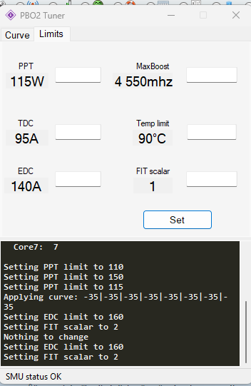Vzdyt to odpovídá jukni, nastaveno jsem mel PPT 115W a v hw info je celková spotreba cpu od 114 az 115W, nastavil jsem stejny hodnoty v CURVE, v limitu pouze PPT, protoze kdyz zkusim zvysit EDC na tech tvych 160, tak to zustane na tech 140 co je max, scalar at zadam 2, nic se nezmení porad je tam 1.