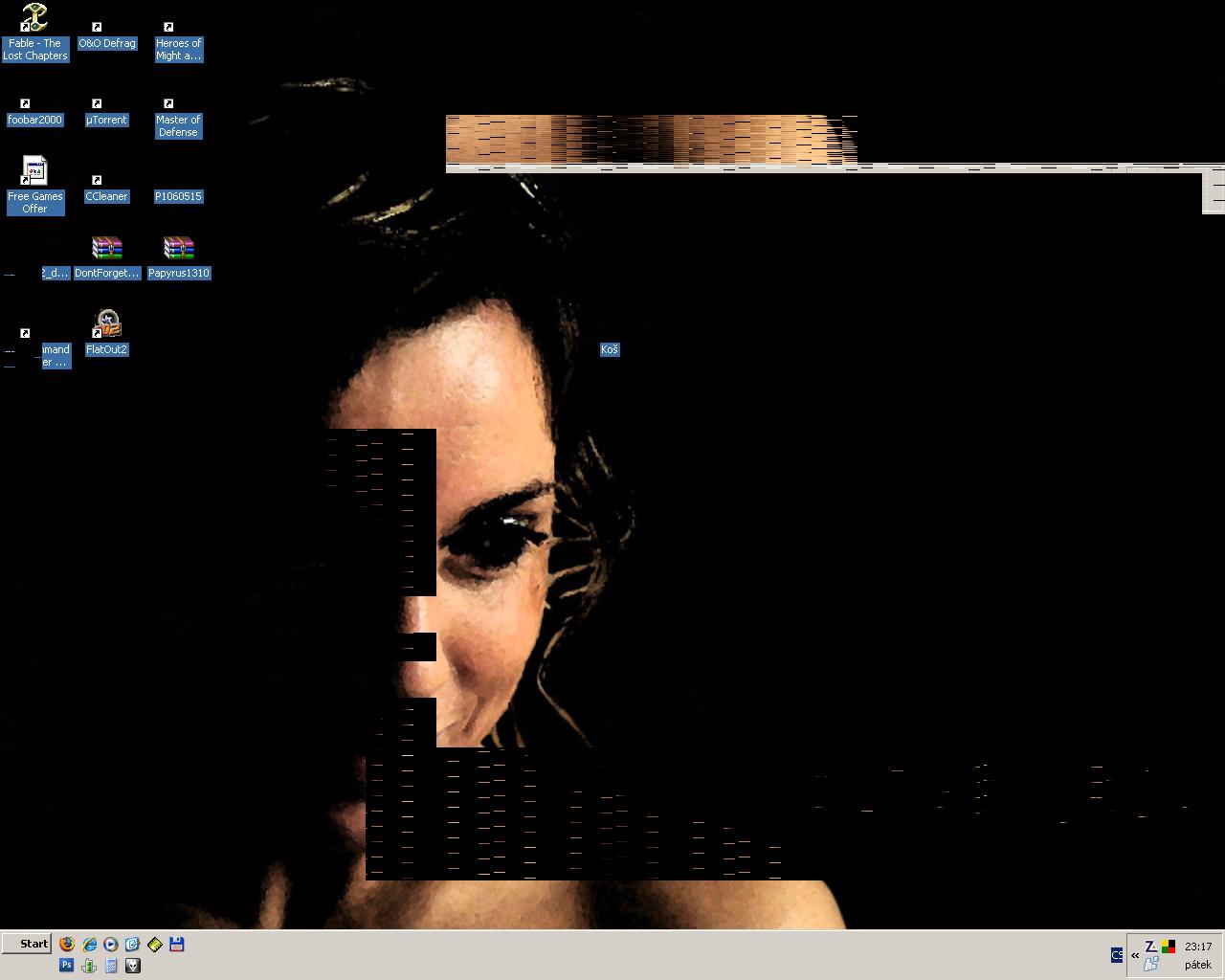 Odebral jsem ze systemu veskere ovladace, pote odebral X1950 z panelu nastroju a resetoval PC... Nabehl v 60Hz, grafiku se systemu nainstalovat nepodarilo... Nainstaloval jsem tedy Catalysty 7.7 jak je doporucovano na http://www.cd-r.cz serveru, ze tato verze je posledni stabilni pro AGP karty... Pote jsem na vyzadani instalatoru opet restartoval PC.... PC nabehlo, ale behem par vterin se mi rozsypala grafika na plose, dle prilozeneho obrazku... Mys presto fungovala, udelal jsem tedy tipanec... Dal jsem pote restart a pote PC jiz nabehlo uplne v poradku... Bez hlasky .MOM chyba atd... Proste nabehlo jak ma, grafika OK atd... Byl jsem spokojen, s tim, ze problem je vyresen.. ALE.. Jakmile jsem se chtel prihlasit na http://www.pc-help.cz abych vas vsechny informoval, zjistil jsem, ze mi NEFUNGUJE KLAVESNICE.... Nereagovala na nic.. Zbytek systemu pracoval uplne v poradku, zadny dalsi problem jsem nepozoroval... Dal jsem tedy restart, a zkusil BIOS.. Tam klavesnice reaguje jak ma, takze je to nekde na urovni Windows, ze mi po instalaci Catalyst 7.7 nefunguje klavesnice... Pote jsem se vratil do nouzoveho rezimu, vratil PC zpet pred instalaci Catalyst 7.7 a klavesnice opet funguje, ale ovladace na grafiku opet hazi error hned po startu systemu....