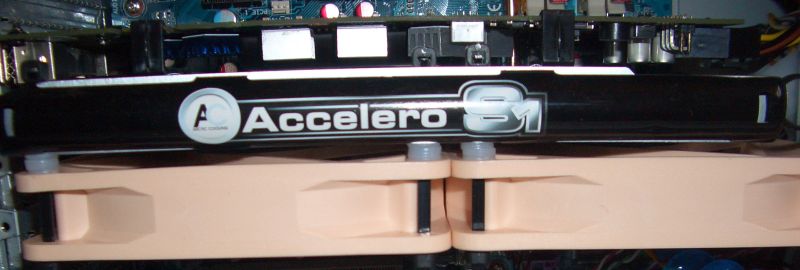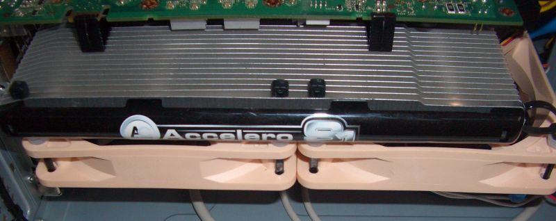 Použil jsem obyčejné stahovací pásky (4 na ventilátor), které jsem provlékl Accelerem zespod.