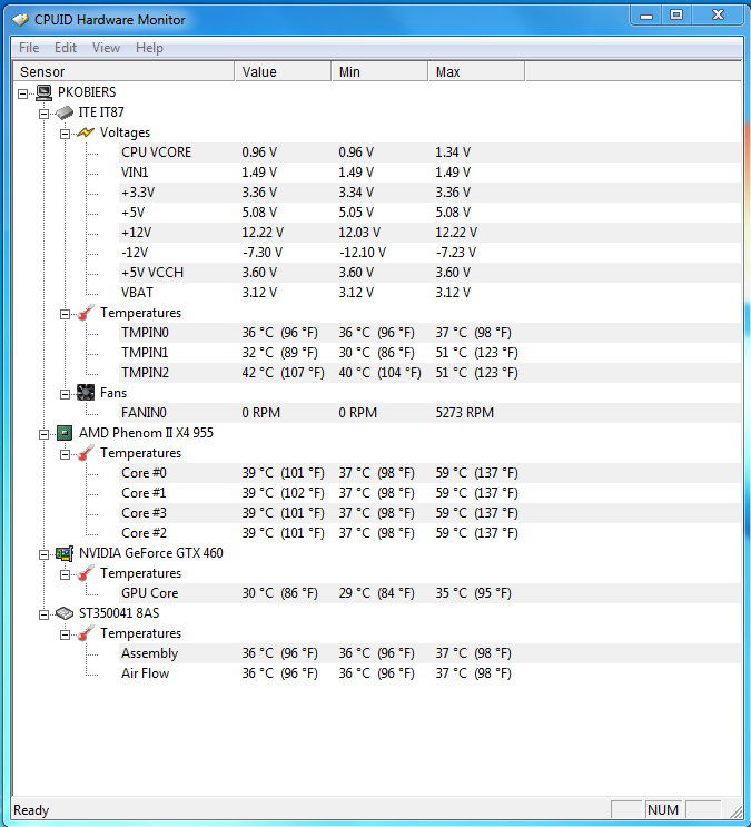 Promiň, s tím napětím jsem se přehlédl. Ten větrák je možná na CPU ale nevím, koukni do bedny co se netočí - také je možné, že HW monitor švindluje.