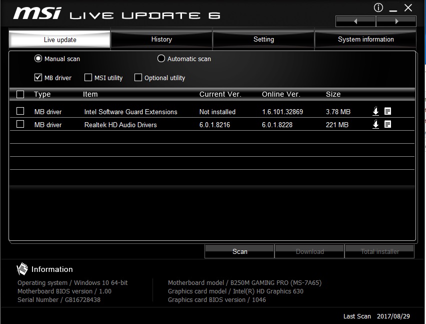 Tak ešte raz skús .Vypni si antivírus ,spusť MSI-Live update , ako Správca.,Klikni na Live update-Manual scan a označ si iba MB bios, či niečo nájde.