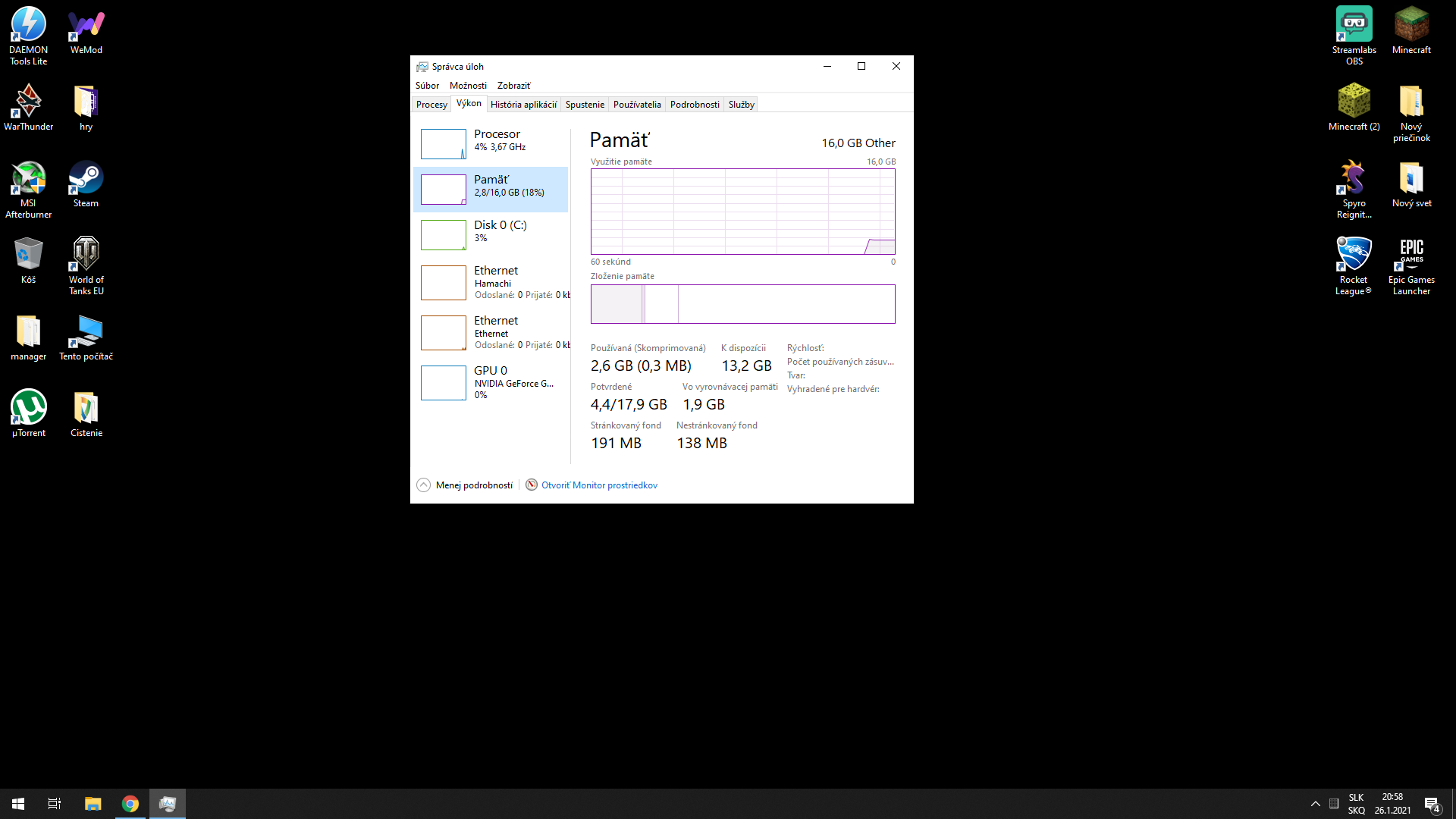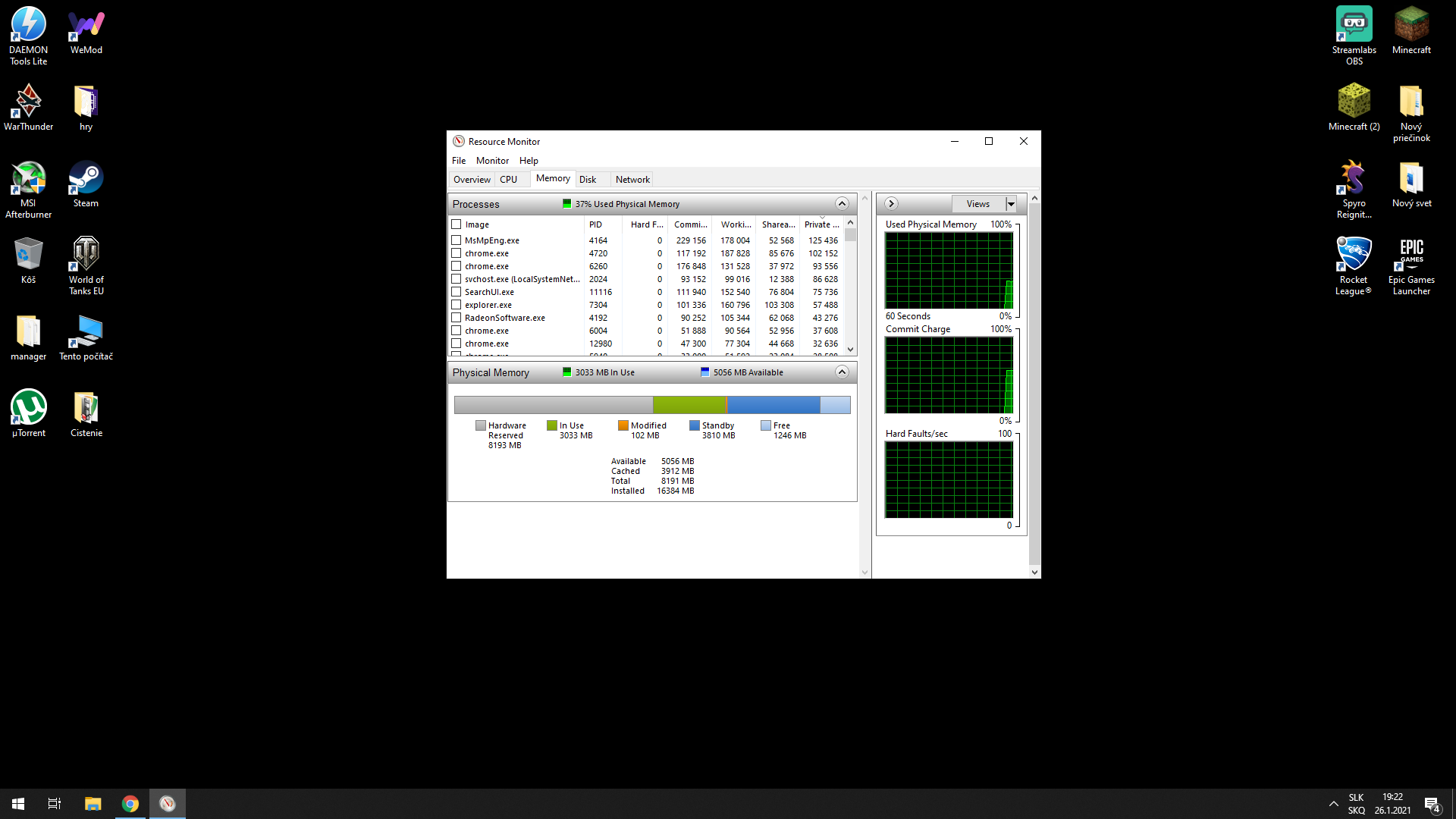 Speccy mi hlási že mám nainštalovaných 16GBaj HW monitor to isté ale ked dám správcu úloh tak mi píše že 8GB je hardware usage a na nete píšu že to može byt biosom alebo tým že som prehodil ramky ale kedže sú všetky rovnaké tým to asi nebude.A PC je teraz dost pomalší takže by som to rád dal dokopy