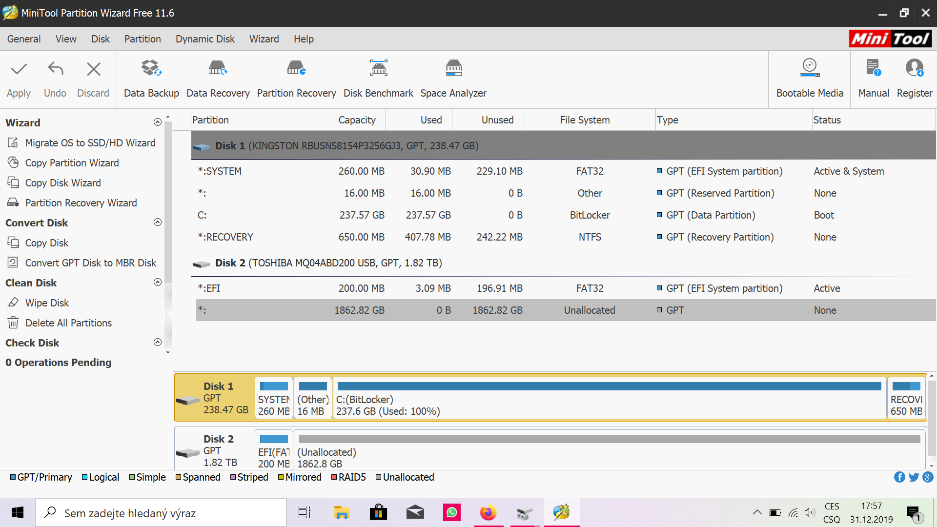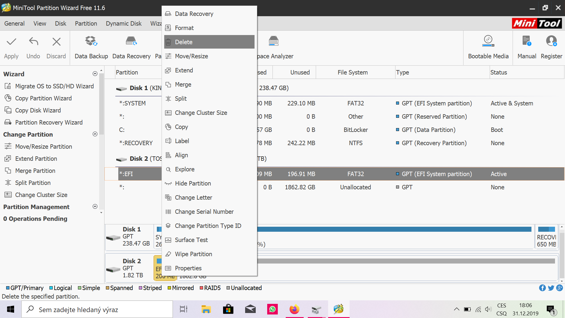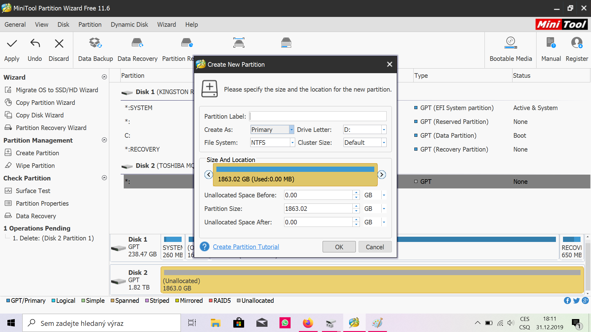 je, teď tedy můžeš odstranit taky ten 200MB, pak tam bude jen jedno velké nepřidělené místo, klik pravým "create" a apply