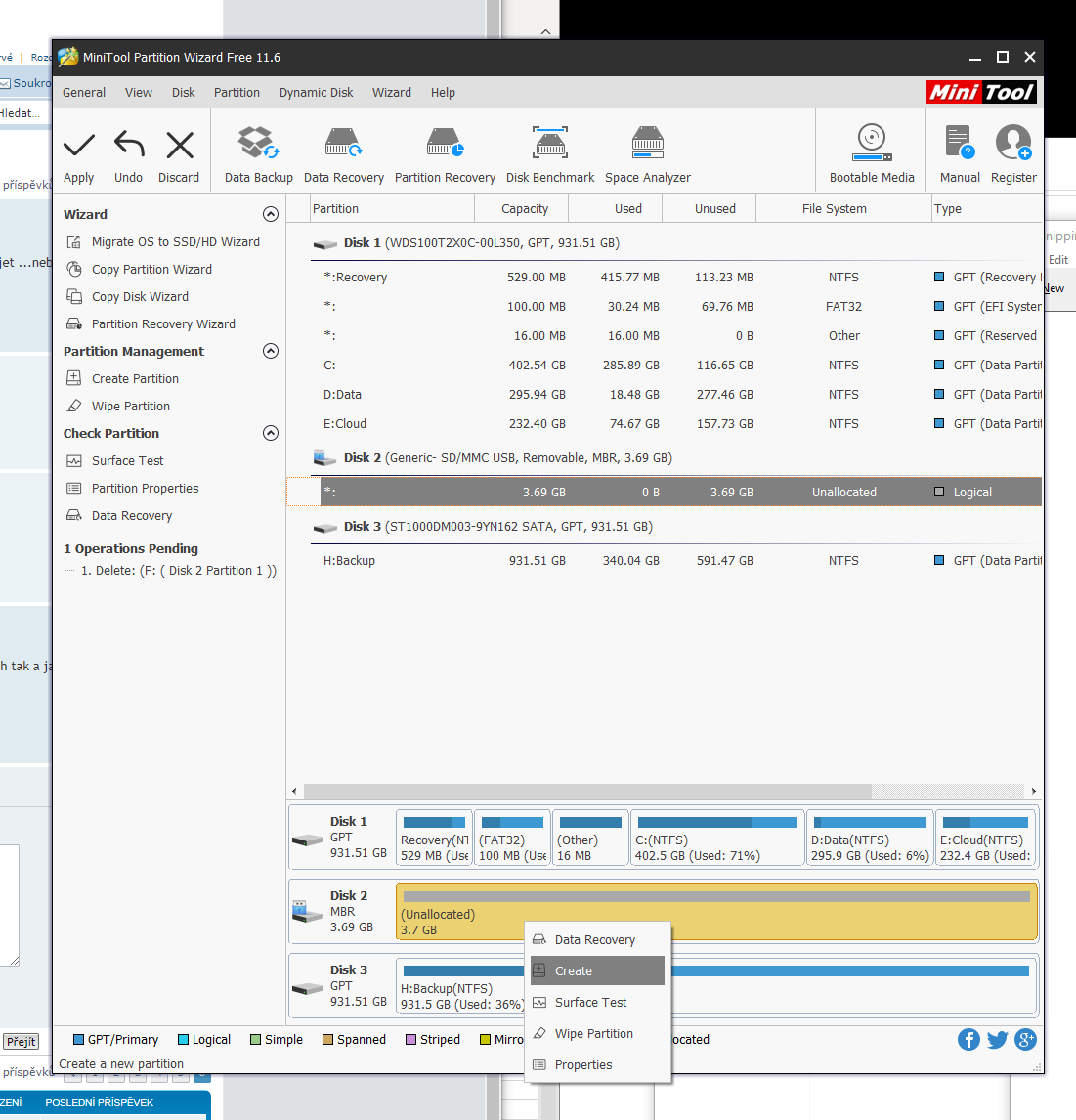 ted na to volne misto zas kliknes pravy a das zvolit create, zvolis si pismeno (drive letter) nebo nech tak a jako label dej jmeno, co chces, treba extdisk.