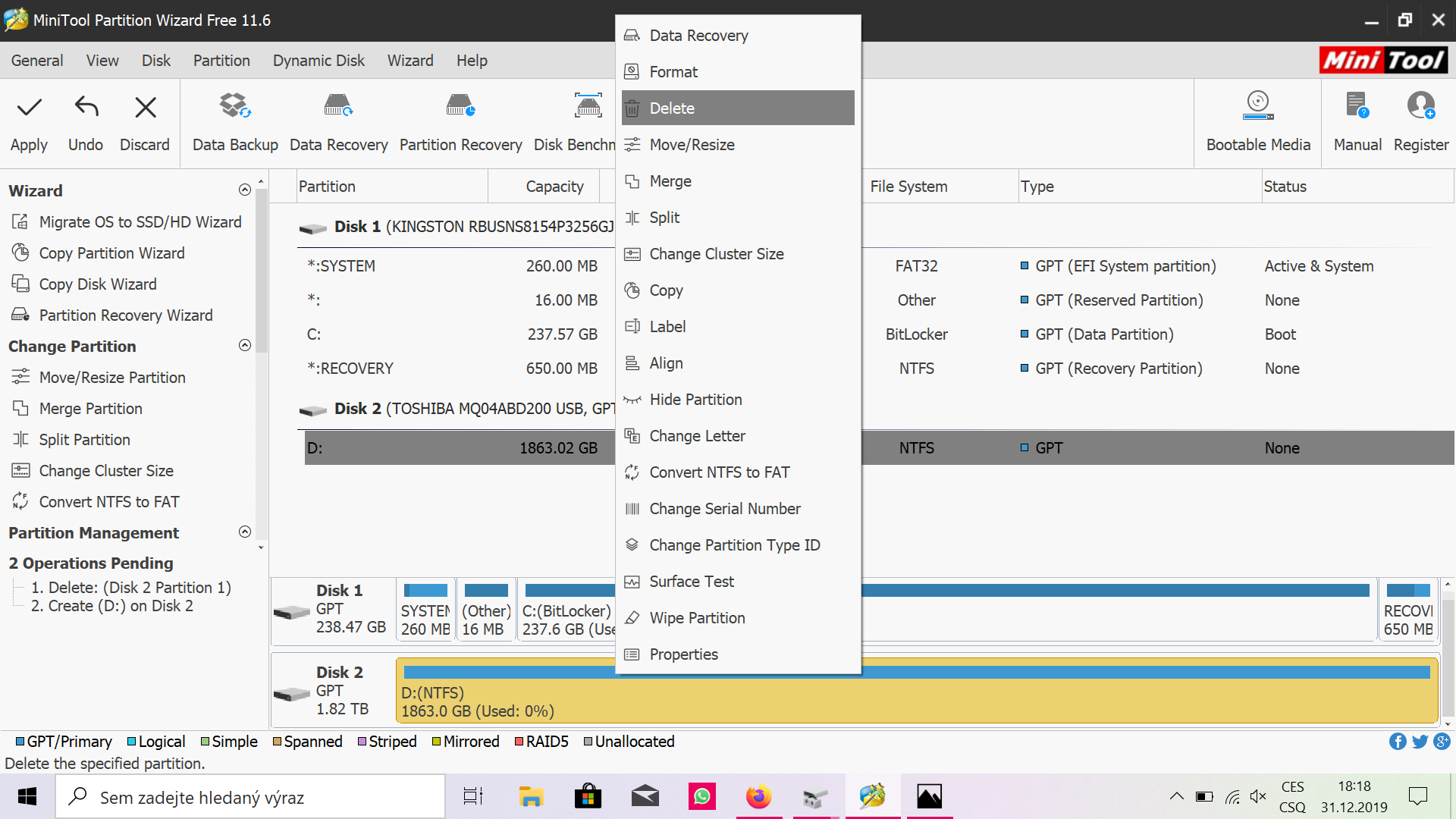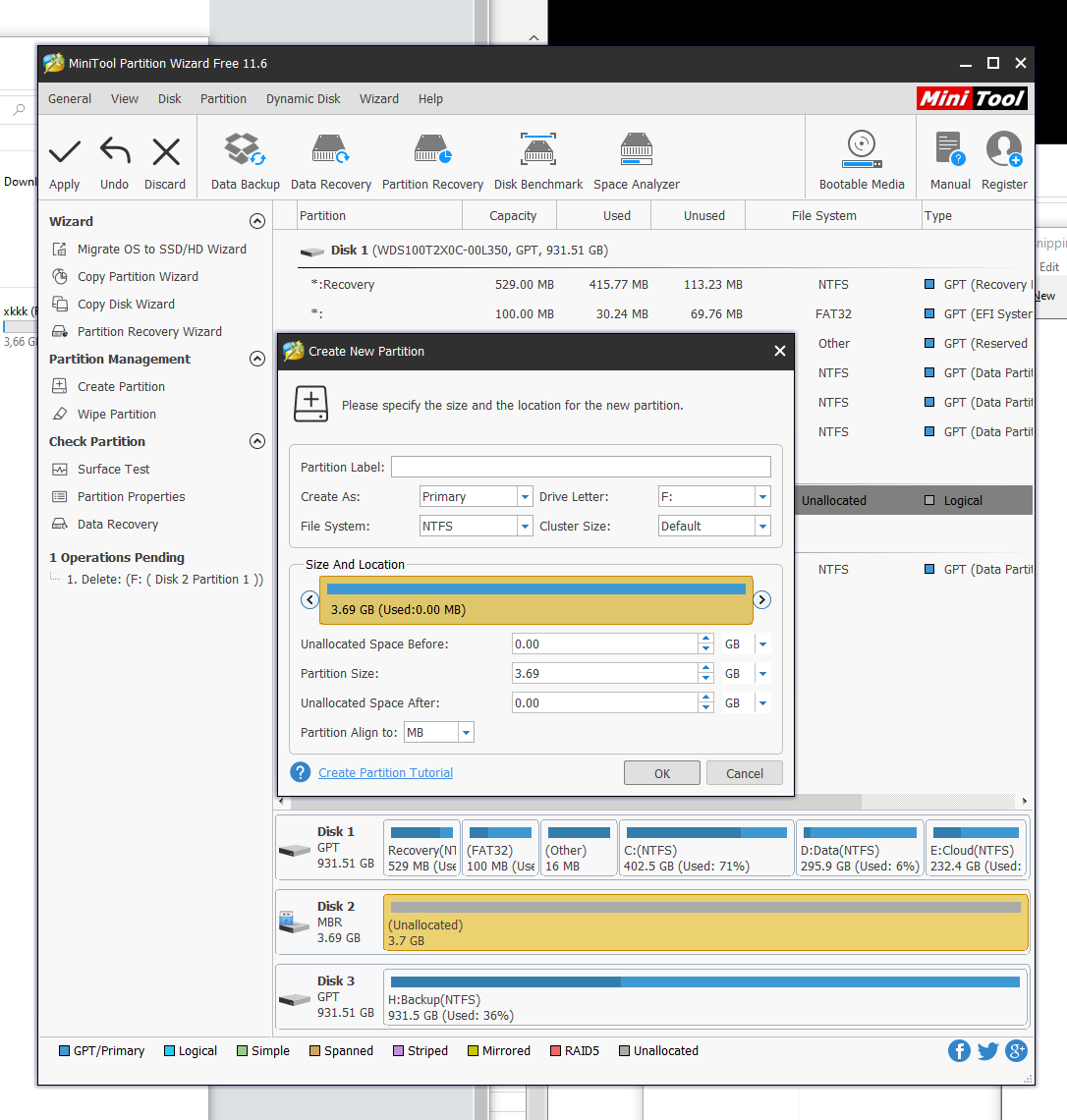 dej jen apply, ať ten proces proběhne, jdi pak do správy disků ve windows a tam z toho nepřiděleného místa uděláš nový oddíl ... stejné jako v tom programu, ale česky