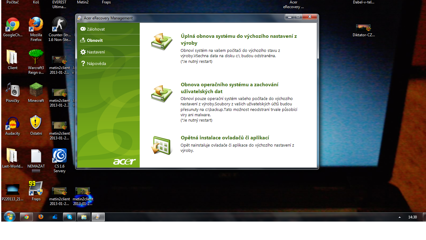 Zdravím,Potřeboval bych obnovit systém a ovladače - Mám i momentálně spuštěný acer eRecovery a najel jsem na položku obnovit ted tam na mě vyjeli 3 věci tyto --> Nevíte někdo co mám vybrat abych obnovil systém jako by .. Vypíná se mi občas totiž ntb - Ale k tomu už můj minulý topic takže kdo chce at si to přečte tak to chci zkusit obnovit a i ty ovladače aby to obnovilo tak prosím poradte co dát .. Díky ahoj :)