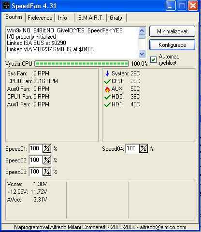 Mám tedy problém s chlazením AUX podle SeedFan jsou na chlazení AUX vyčleněny dva regulované ventilátory Bohužel nemám tam ani jeden zapojen. Dále nevím co si pod zkratkou AUX mám představit. Jo a ještě mne zaráží že AUX nepřeleze 51 stupňů tak jesli chyba není v nastavení SpeedFun a já nedělám z komára velblouda.