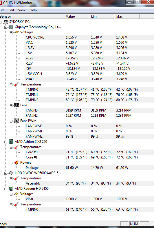 1) AMD Athlon™ II X2 - 250 -> max. temp = 74°C. Je možné, že u tebe ve velké zátěži dochází k aktivaci softwarového chlazení procesoru, teploty jsou na hranici.