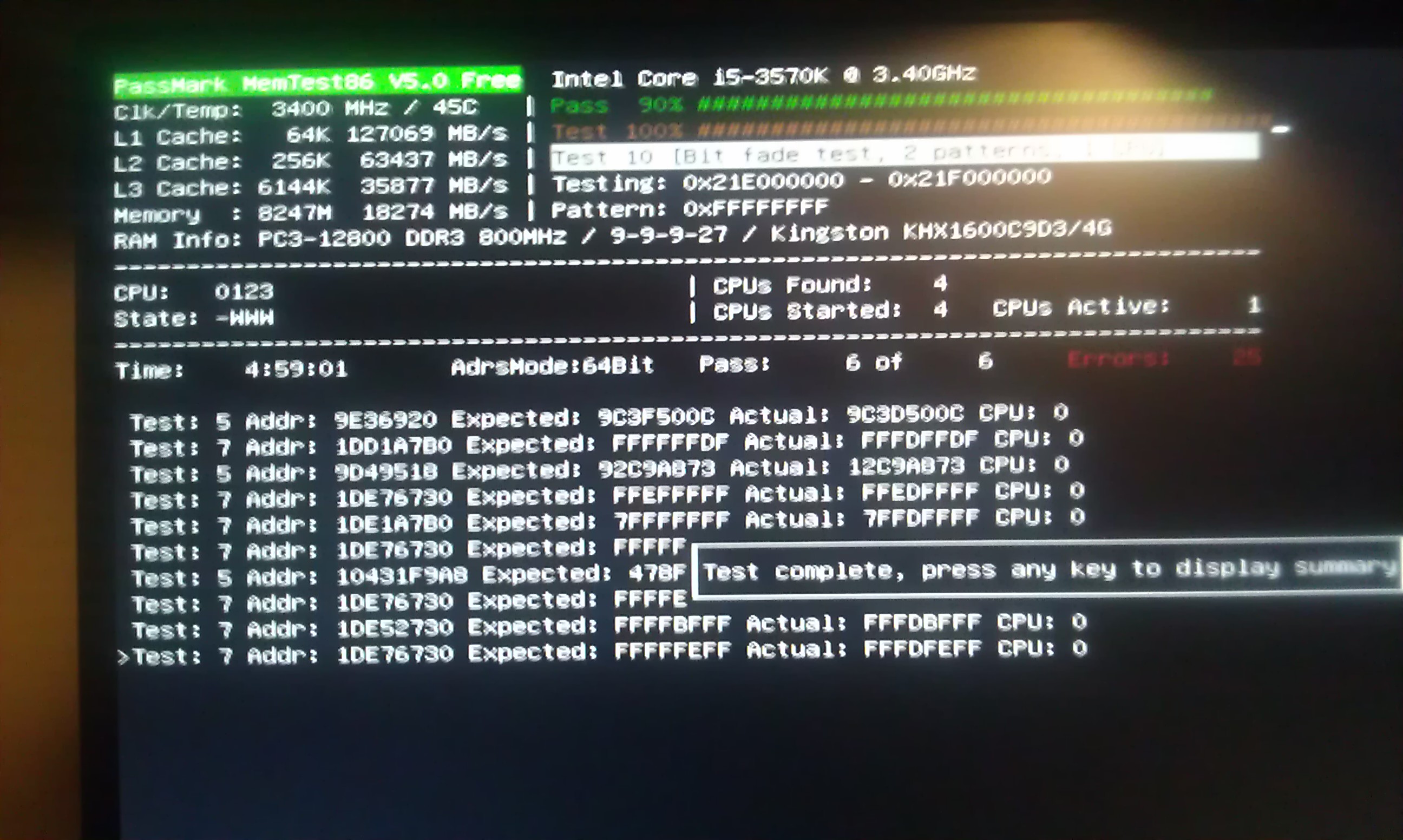 Pohádka má pokračování. Dneska jsem absolvoval modrou smrt [přikládám fotku]. Zároveň přikládám fotky z posledního testu v Memtest86.