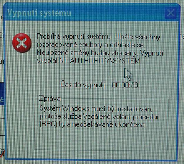 Zdravím všechny.... Mám malej velkej problém s XP proffesional. Nedávno jsem formátoval a ješte ten den se mi začal počítač samovolně restartovat s hláškou : ,,Probíhá vypnutí systému. Vypnutí vyvolal NT/AUTHORITY SYSTEM , Systém Windows musí být restartován, protože služba Vzdálené volání procedur (RPC) byla neočekávaně ukončena.´´ Takhle se mi to sype třeba 50 krát za den. Přiložil jsem foto té hlášky, pokud někdo ví co s tím, prosím poraďte mi. Díky