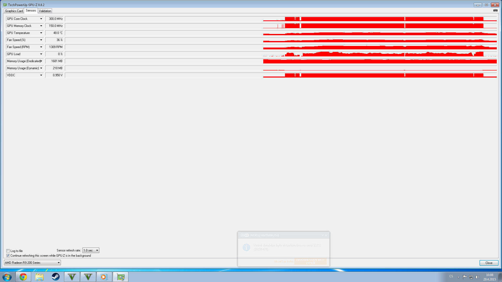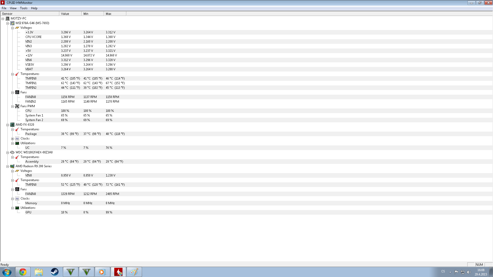 Je to foceno při plné zátěži, nechal jsem ty programy běžet asi 10 minut. Pak jsem skočil do windowsu na rychlé odfocení, tak tady to je.