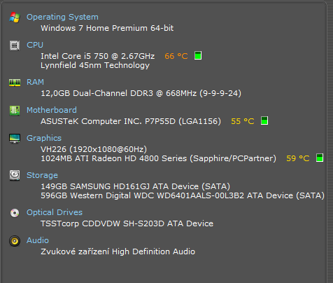 Windows 7 Home Premium 64-bit SP1; Intel Core i5 750 @ 2.67 GHz Lynnfield 45nm Technology; RAM 12,0GB Dual-Channel DDR3 @ 668MHz (9-9-9-24); Motherboard ASUSTeK Computer INC. P7P55D (LGA1156)
