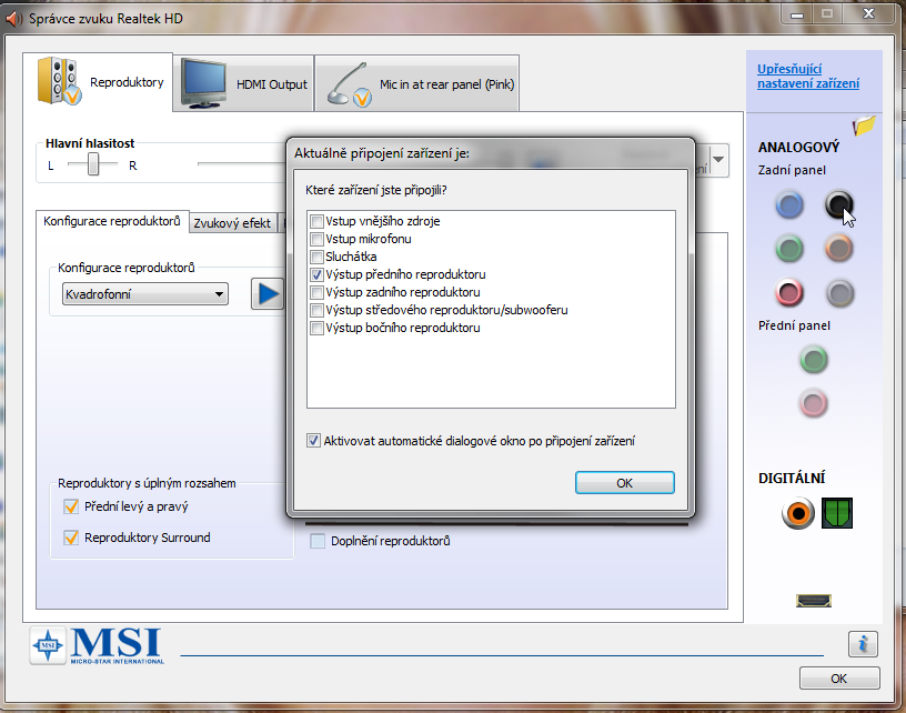 hmm no tak možná je vadný konektor v počítači.. Jistě tam máš těch konektorů víc, zkus to zapojit třeba do černého konektoru a přemapovat reprodukory na něj (viz screenshot).