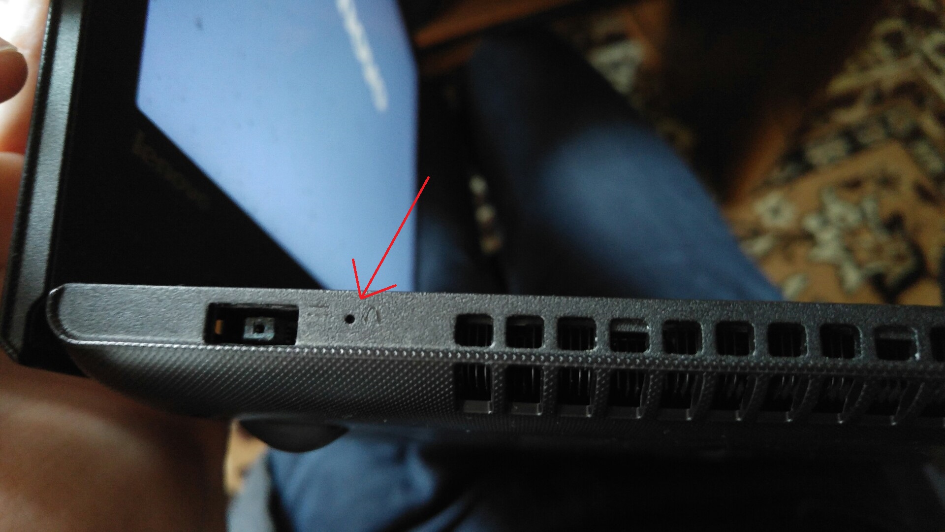 Nalevo od větrací mřížky by měl být malý čudlík pro spuštění obnovy systému a např. vstupu do BIOSu.