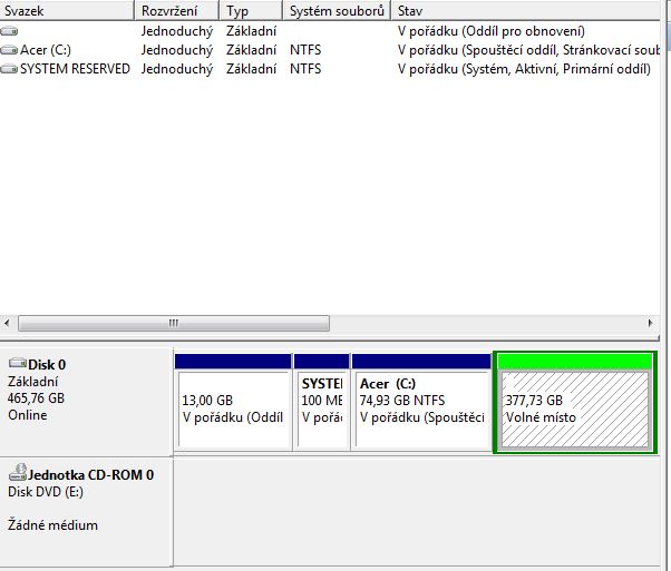 Ve správě disků je daný oddíl zobrazen jako volné místo (viz příloha).
