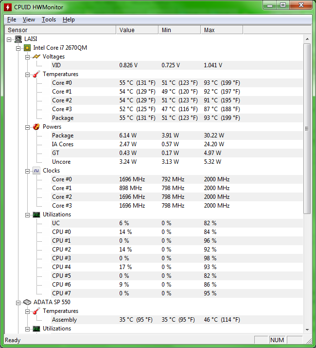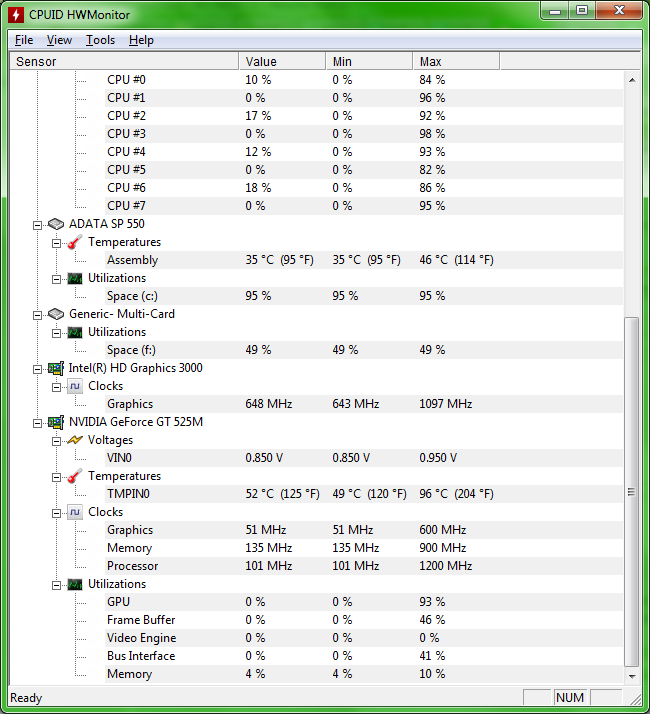 Teploty (program jsem spustila po spuštění počítače - tomu odpovídají teploty min, pak jsem na 15 minut zatížila PC hrou s nízkým grafickým nastavením - to jsou ty max teploty, následně byl počítač asi půl hodiny v klidu - čemuž odpovídají současné teploty)