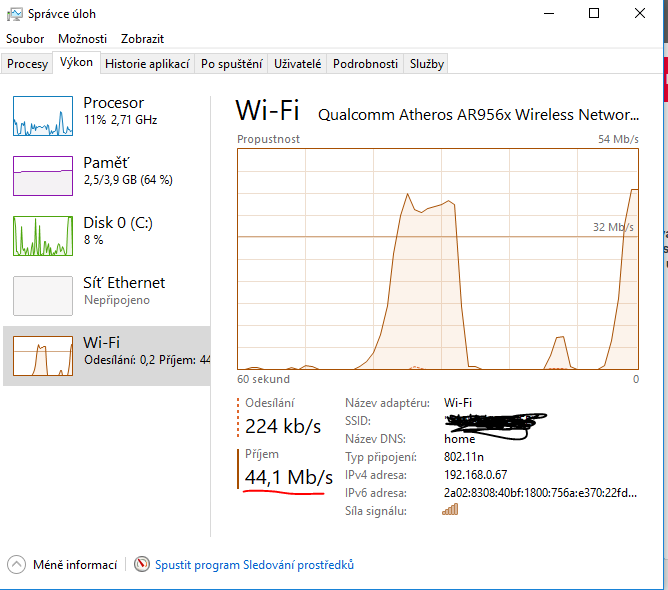 Síťovku jsem měl podezření na wifi, ale když je rychlost neměnná - ať už přes kabel nebo wifi, TAK SI NEVÍM RADY, ČÍM TO TEDY MŮŽE BÝT. Jestliže přes wifi je maximální rychlost kolem 30Mb/s a přes kabel taky, tak nevím, zda-li může špatná LAN sít. karta ovlivnit i příjem přes wifi.[image][/image]