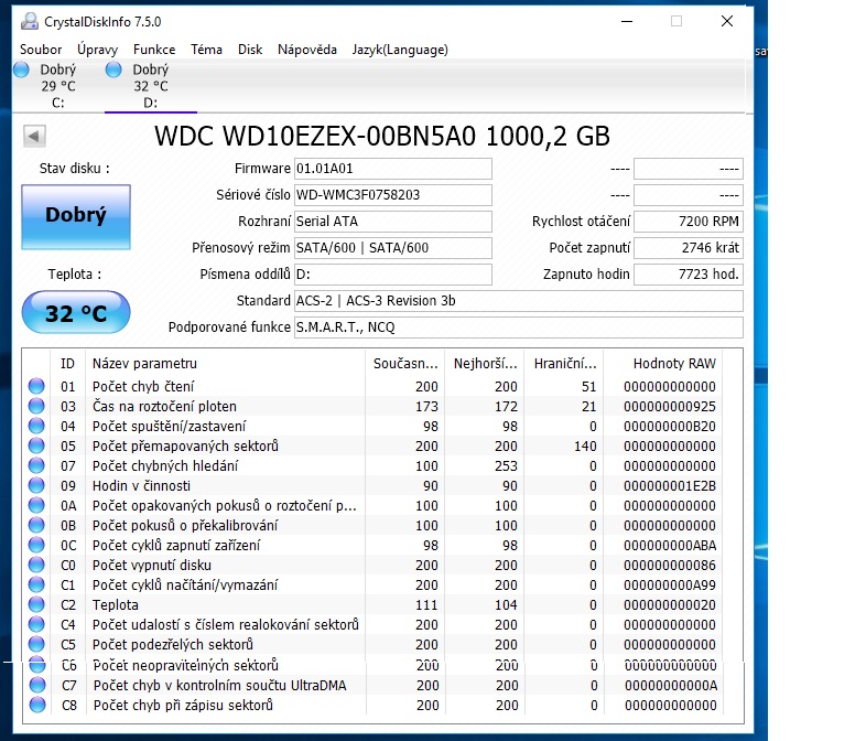 Disk se v Crystal Disk Info se tváří že je ok.Přikládám sreen.