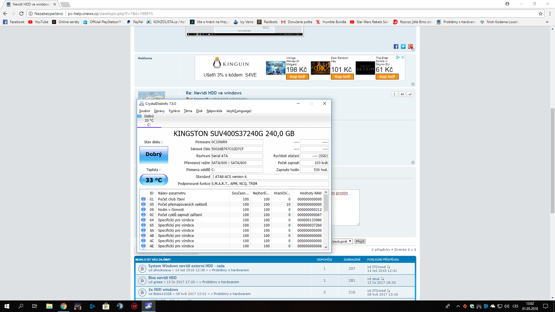 Udelej tech 10 restartu a az bude viditelny, spust Crystal Disk Info.