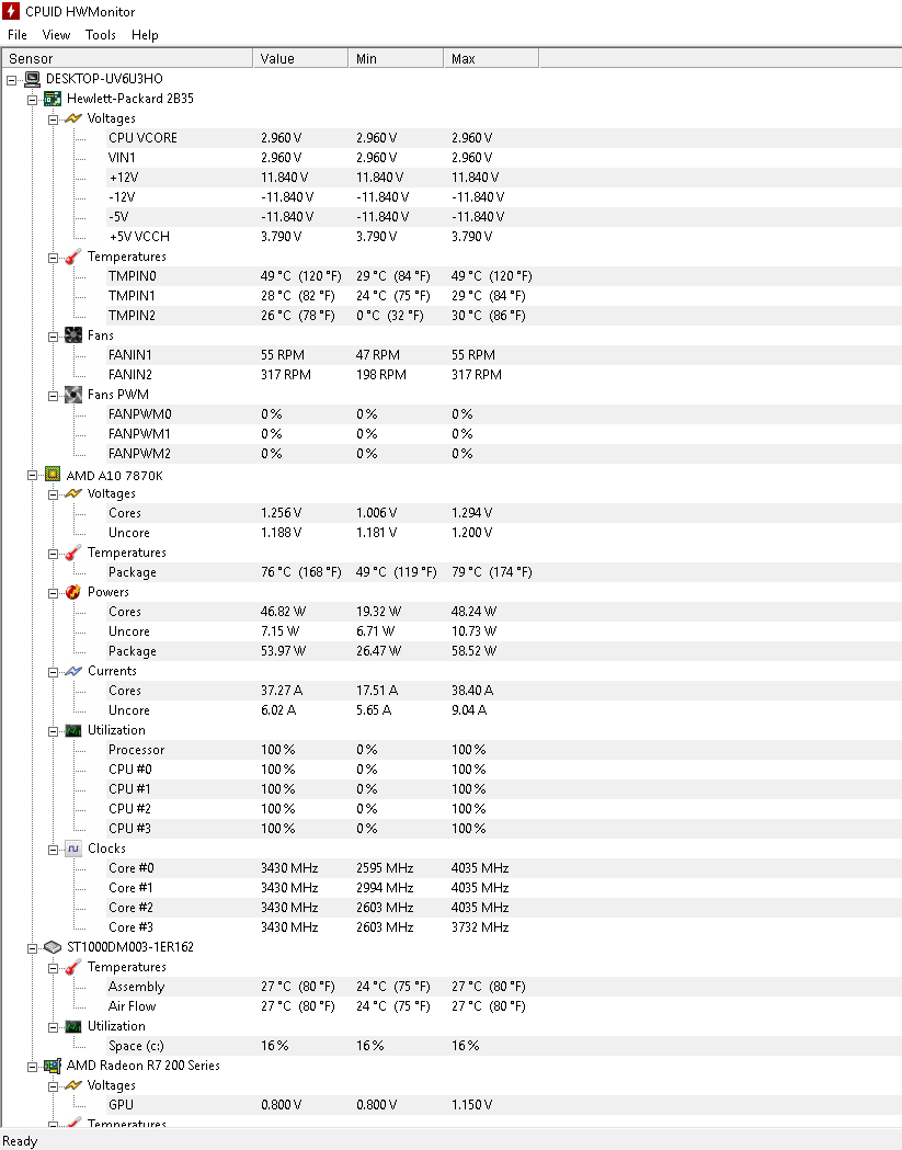 Stáhl jsem nějaký program na zátěž CPU nechal to asi 10min a tady je Screen. Teploty přes 80 nešli, ale když hraji hry, tak jdou až na 85 někdy.