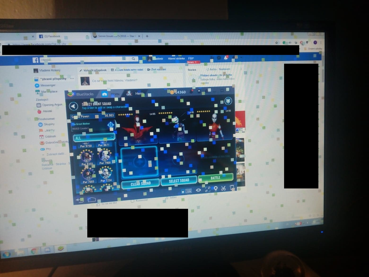 Objeví se "čtverečky" (viz obrázek), po chvíli zamrzne kurzor, nejde nic klikat (pokud jde, není to vidět ala obrazovka zamrzla?).