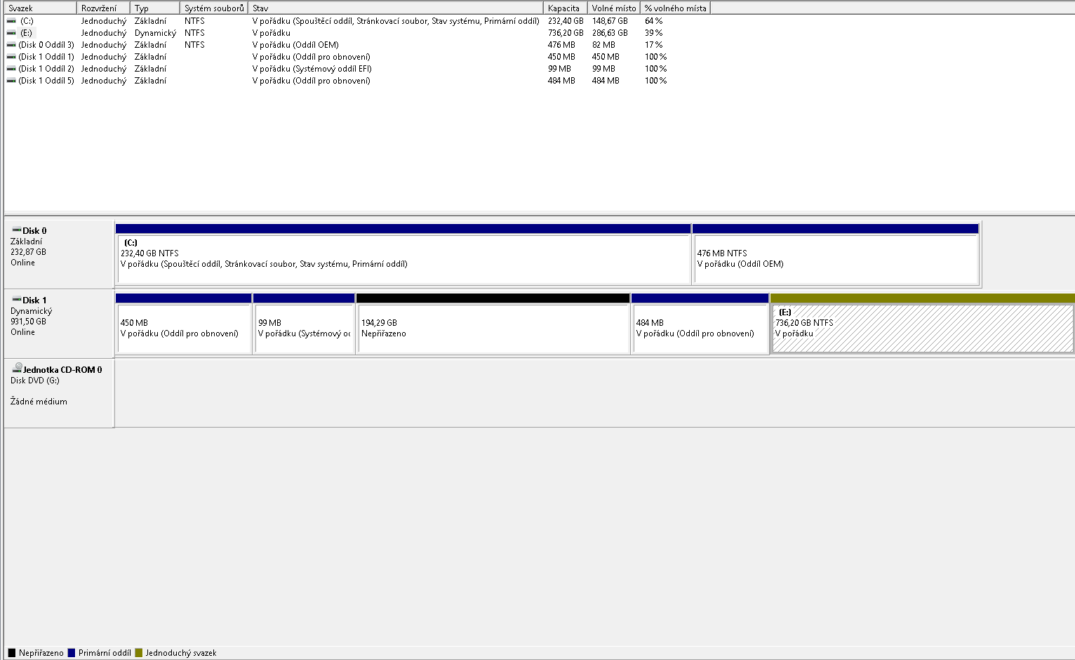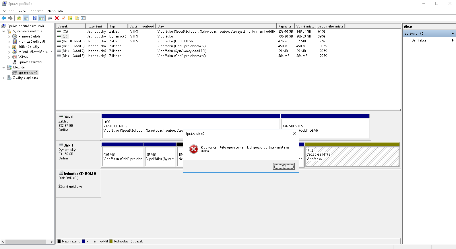 Dobrý den, přeinstalovával jsem system na SSD, ale nechal jsem si data na HDD. Následně jsem formátoval 1 svazek HDD, na kterém jsem měl system. Když jsem ho chtěl spojit s druhým svazkem HDD vyskočila mi tabulka: K dokončení této operace není dostatek místa na disku.