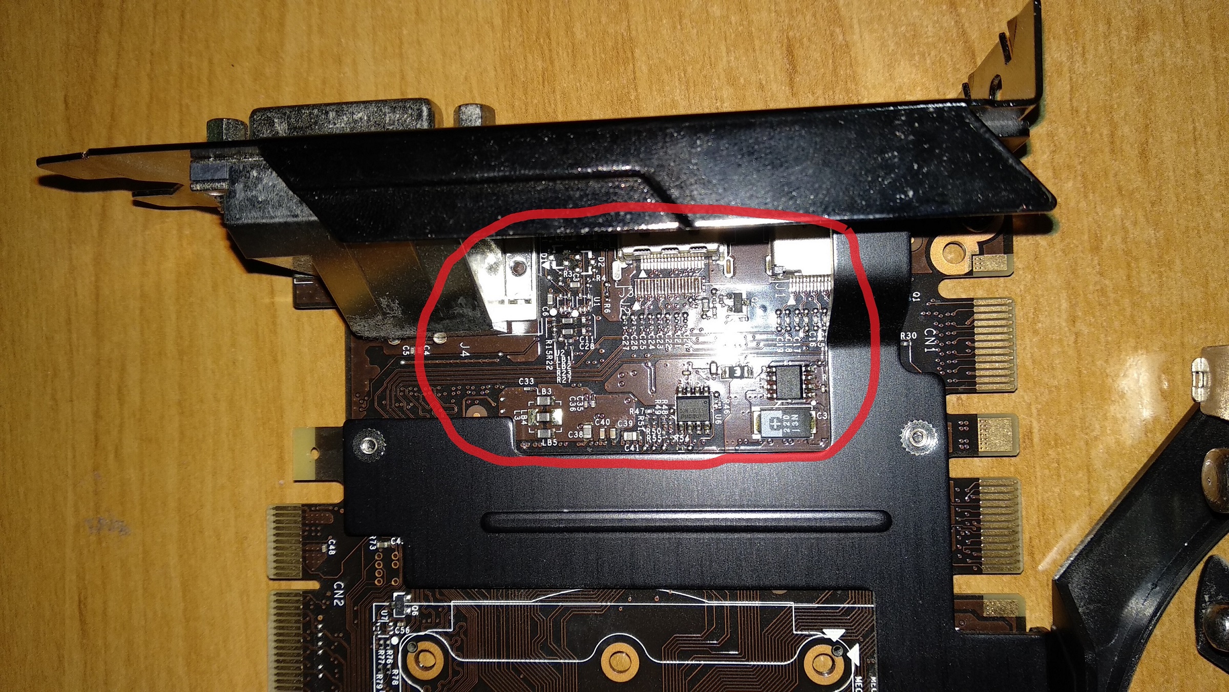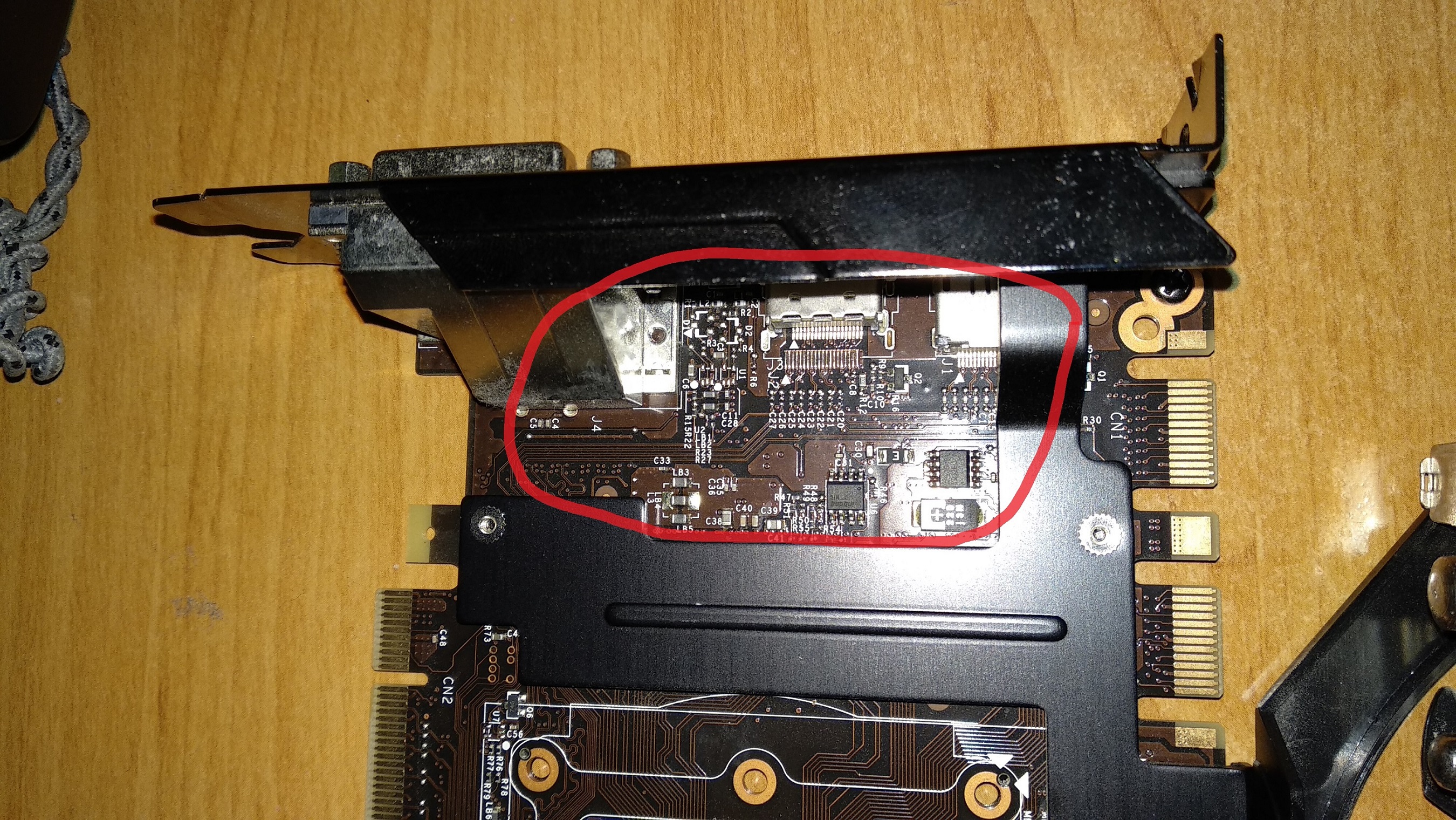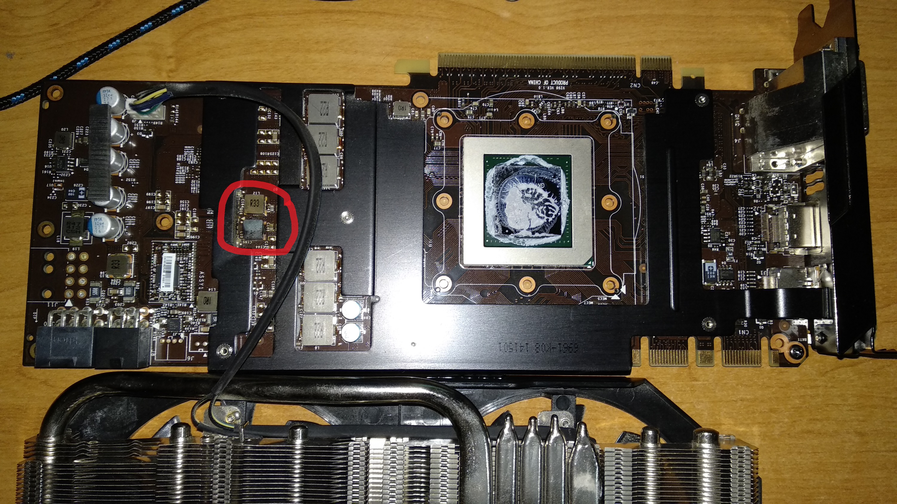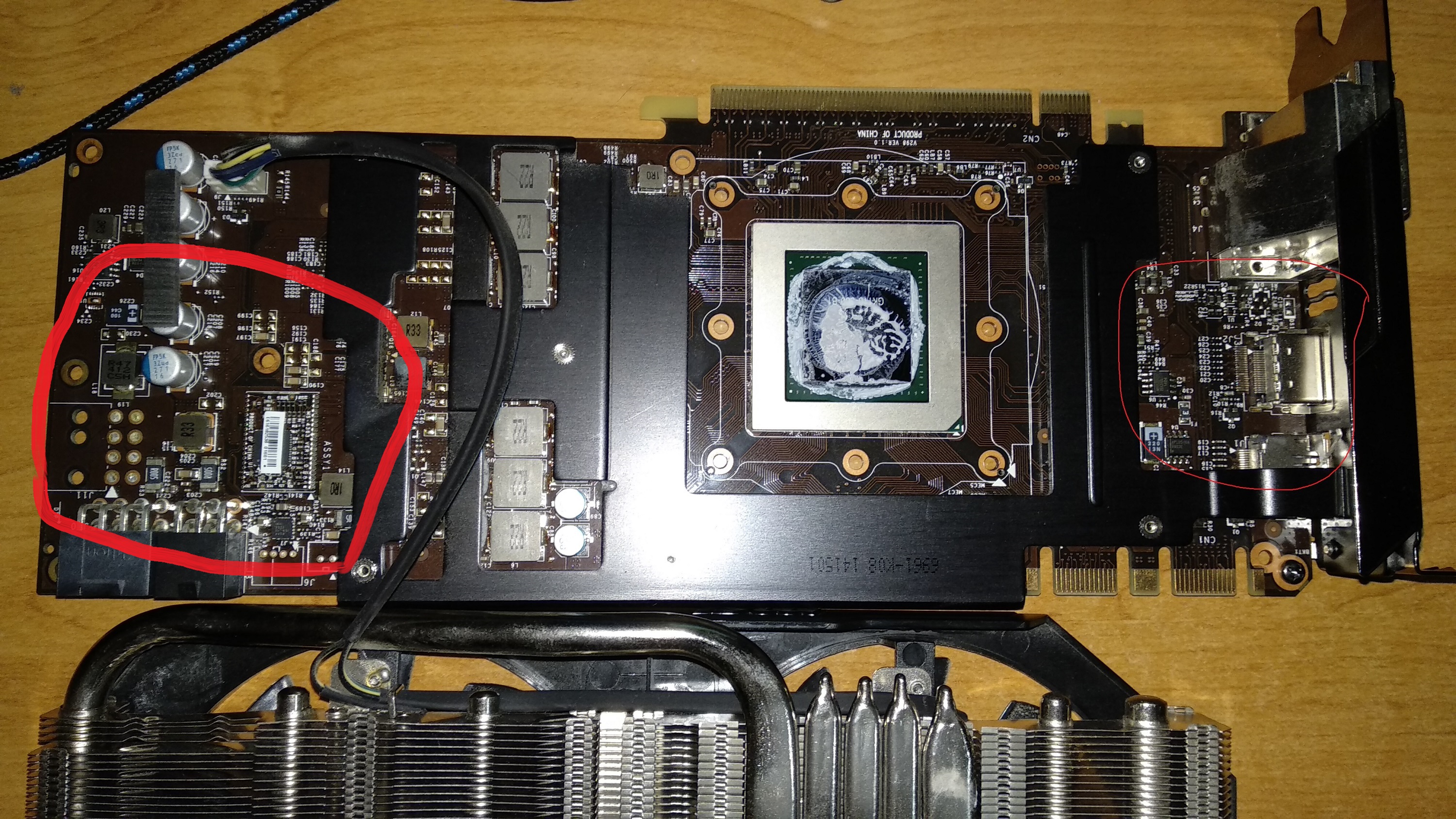 Viděl bych to na problém v napájení, ta cívka "R33" (1. obrázek, pravý horní roh červeného "oválu") vypadá divně, problém může být ještě pod tím černým chladičem.