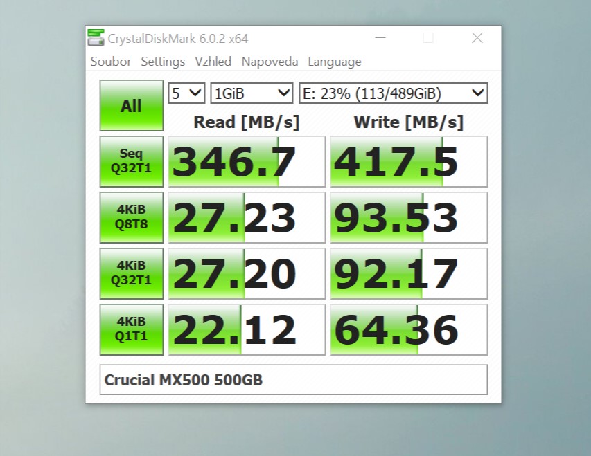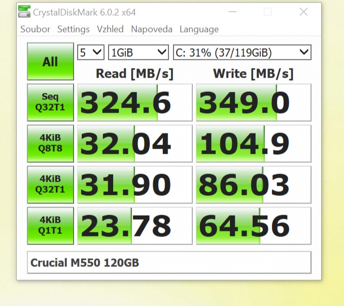 Menší chybka z mojí strany, resetoval jsem BIOS a zapomněl jsem dát zpátky AHCI protokol, takže ty testy jely na IDE protokolu. No u Crucialu MX500 se rychlosti spravily. Ale na M550 na kterém mám systém jsou stejné. Takže můžeme z toho usoudit, že disk nepracuje jak má a proto dostávám tyhle šílené záseky?