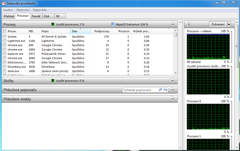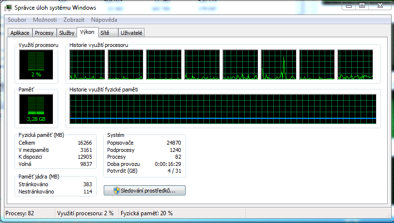 Ve sledování prostředků není nic nijak zvlášť vytížené, vytížení CPU nepřekročí 15% a to ani při zapnuté hře. RAM také - cca 70% paměti stále k dispozici.