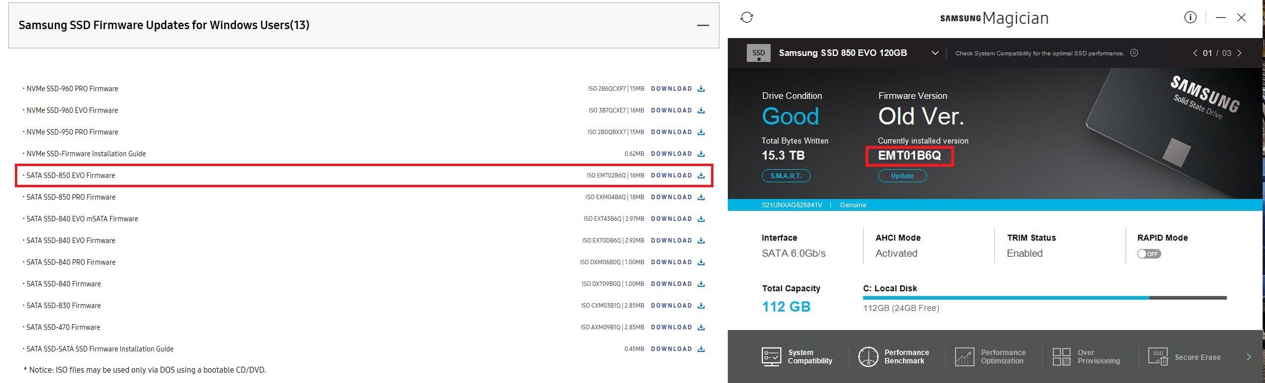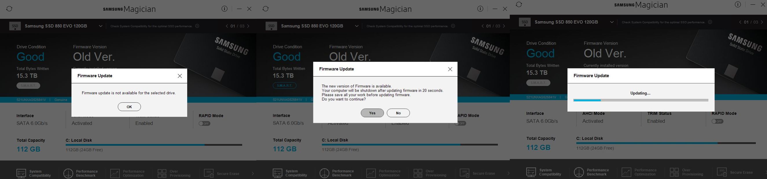 2. Zkoušel jsem udělat ten update přes samsung magician. Když dám update, ta vyskočí hláška, že je novější verze k dispozici o čemž svědčí i část obrázku, kde je vidět, že je novější verze, jestli chci pokračovat, tak dám ano a naskočí okno updating, kde to doběhne tak do půlky a skončí to hláškou, že pro změnu firmvare není k dispozici..co je tedy špatně ? děkuji..