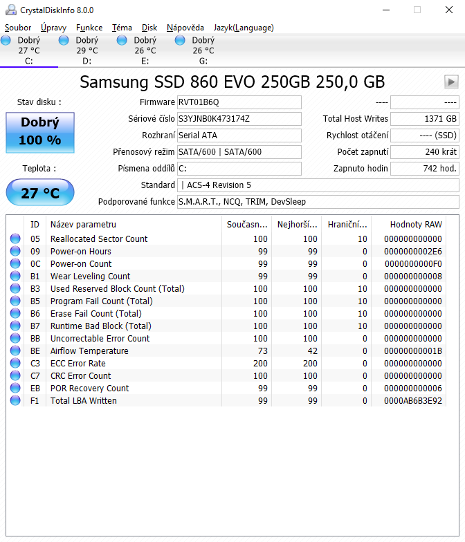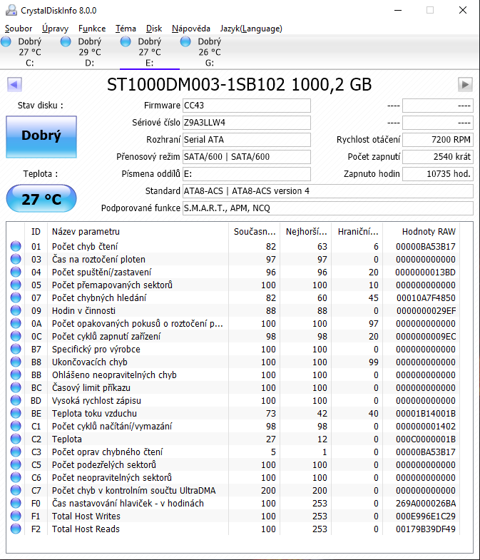 je to správně, ňákej odborník přes disky ti to podrobně zkoukne, každopádně na tom hadru ňáký výkyvy v pár hodnotách vidim (netušim jak moc sou pro hladkej chod podstatný)... pokud je to možný, tak ten hadr odpoj, zkus fungovat ňákou dobu bez něj a sleduj esli se to bude dít furt...