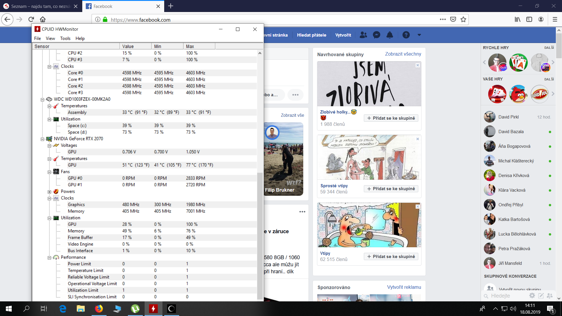 posílám screen teplot PC a grafické karty z HW monitoru. Toto je cca za 10 minut 3x jsem prošel bechmark Shadow of Tomb raider. Kartu mám od února letošního roku, dříve se tak nechovala, začal se takto zahřívat, až když přišly vedra (pokojová teplota cca 25-30C). Nejvíce je hlučná při cutscenách a teď při World of tanks hlučí ještě častěji než při hraní klasických her.