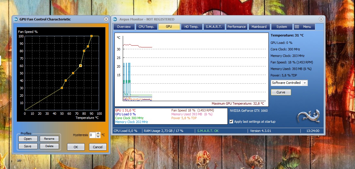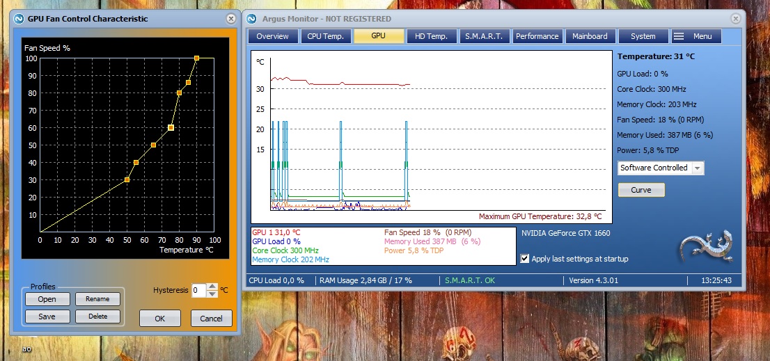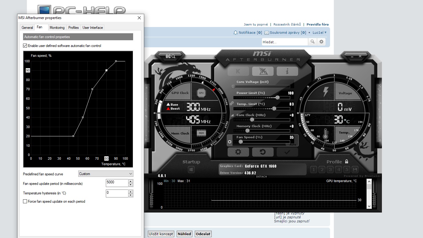 Bylo mi porazeno, ať nastavim křivku v MSI Afterburner, což také pomohlo. Ale dnes, když jsem pustil počítač, tak se zase větráky zapínaly a vypínaly (teplota GK byla 30 stupňů). MSI Afterburner byl zapnutý hned po startu a byla nastavená stejná křivka. Musel jsem tedy manuální ovládání větráků vypnout a zase zapnout.
