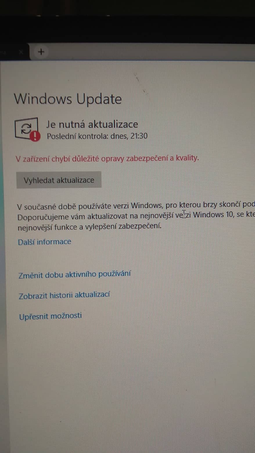 Dnes mě Windows nabídl instalaci aktualizací, byly to aktualizace, abych mě nadále podporu Windows. Aktualizace jsem stáhl, pak mně počítač vyzval k restartu. Počítač se restartoval, probíhala aktualizace. Naběhla na 100% pak se měl spustit systém Windows, počítač jel bedna hučela, ale obrazovka byla černá. Počkal jsem asi 15 min a nic se nedělo. Zmáčknul.jsem tlačítko restart, situace byla stejná černá obrazovka. Pak jsem vypnul pc tlačítkem napájení. Zapnul pc a pořád nic. Zkoušel jsem vypnout i zdroj a pak zapnout pc, ale pořád nic. Nechápu co se podělalo... Nevím jestli to je tou aktualizací. Podobná situace se mně stala nedávno, když jsem instaloval ovladače GK. Tenkrát se pc, ale spustil normálně, po vypnutí zdroje. Poraďte někdo co s tím.