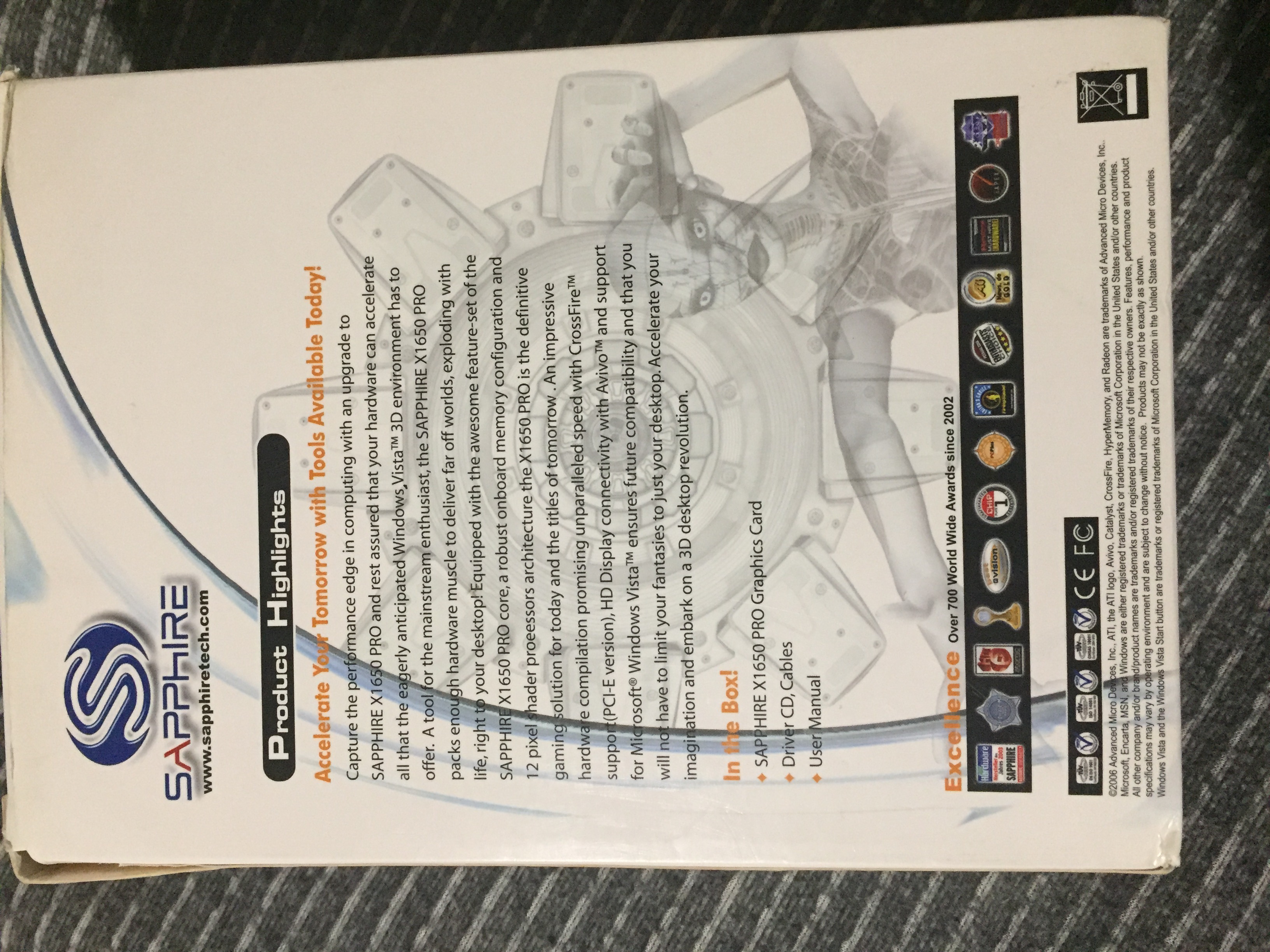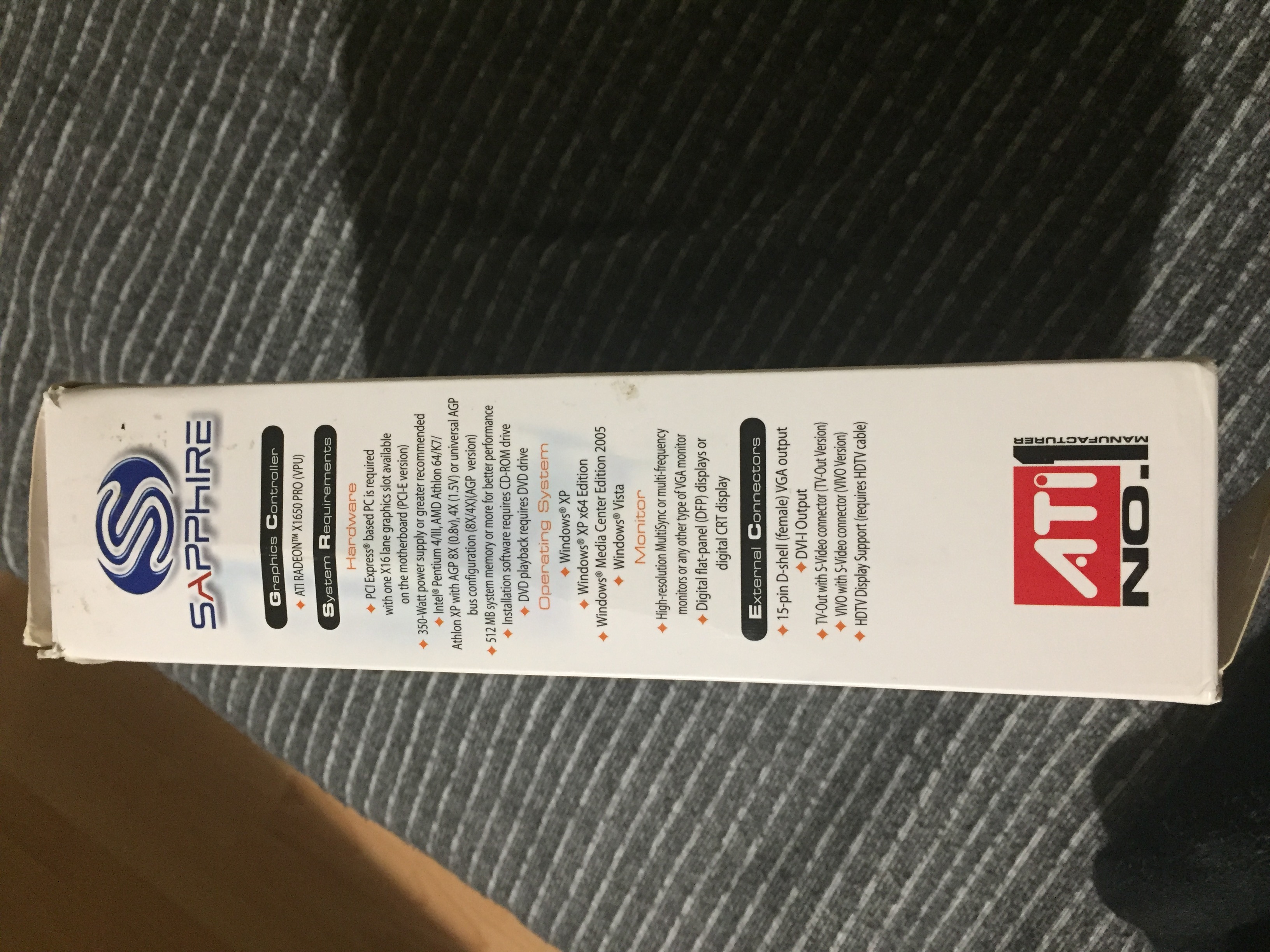 Dobrý den, nedávno jsem procházel zapadlé věci v mém pokoji a nalezl jsem Grafickou kartu Sapphire x1650 Pro 512mb, a netuším jestli má nějakou cenu.. je nepoužívaná ale nejspíše stará.. jelikož si nepamatuju odkud se tady vzala :D no.. rodiče taky netuší.. k otázce.. Jakou prodejní cenu muže mít? (Pokud vůbec) - pokud má prodával bych na bazarech. Fotky jsou v přílize.
