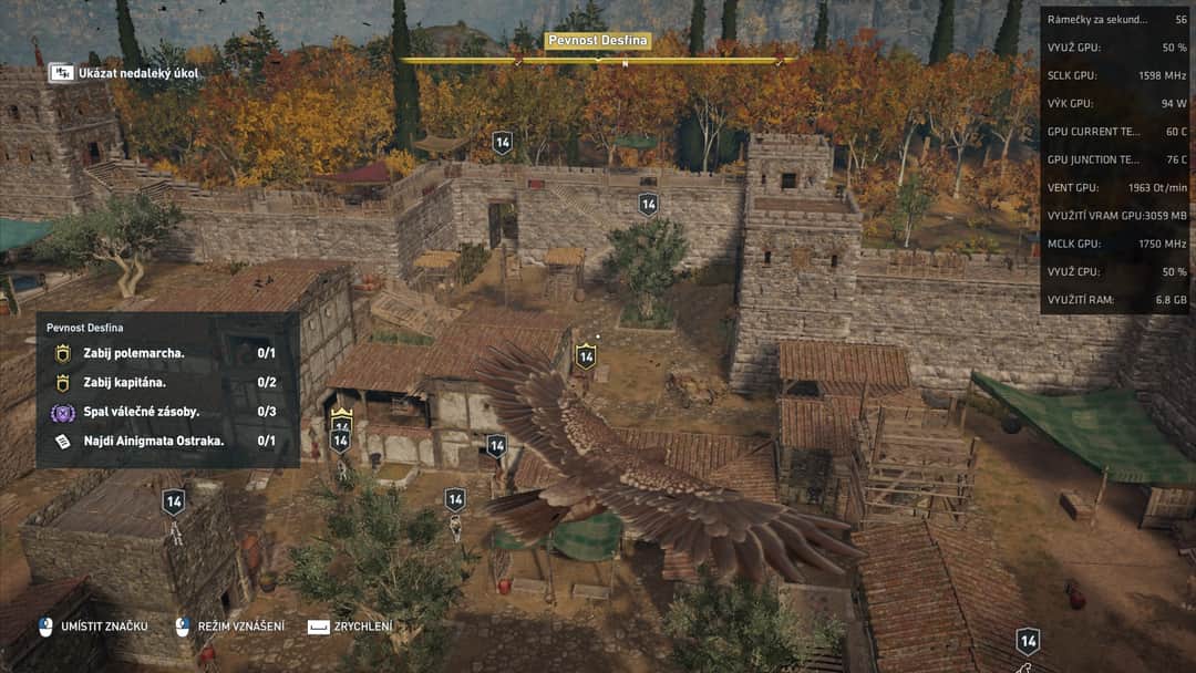 Ve zkratce, v místech, kde je potřeba, aby grafická karta jela naplno, jede zhruba na 50% a tím pádem nemám stabilních 60fps.