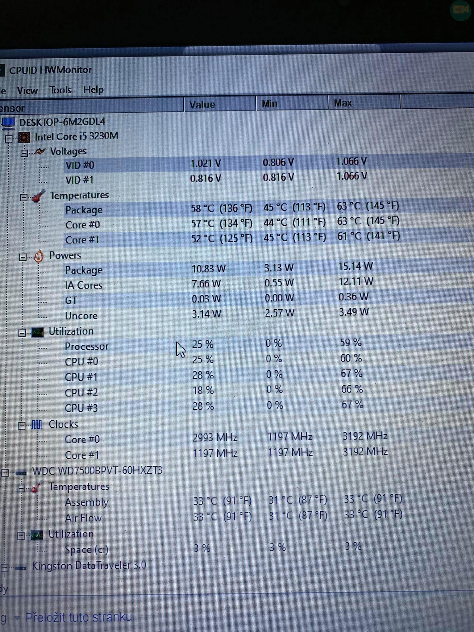 Zkusil jsem notebook reinstalovat, opět v pořádku a stáhl jsem HW monitor - teploty viz. příloha (omlouvám se za foto telefonem, ale počítač byl již v této chvíli zamrzlý). Notebook byl pravidelně čištěn, po sundání spodního krytu není nikde prach ani nic jiného. Zkoušel jsem přes BIOS spustit dva nějaké testy, které mi to nabídlo - HDD a Memory, oba v pořádku.