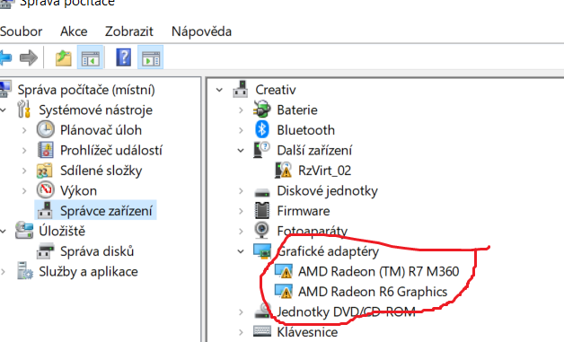 nemůžu aktualizovat svůj grafický ovladač. U ikonek mi to zároveň píše podivné vykřičníky. Systém mi píše, že ovladače jsou nejnovější, ale pochybuji, když se mi např. cs 1.6 (originál přes steam) spustí jen v okně a s 5ti fps. Hru jsem zkoušel reinstalovat, nepomohlo. Dále mi nejde nainstalovat AMD software radeon. Píše mi to zase, že nemám nainstalovaný žádný ovladač grafické karty. Děkuji za rady.