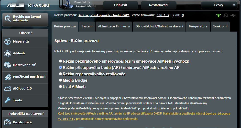 K tomu screenu - asusy jsou jedny z mála routerů, kde výběr provozu AP přepne WAN port do režimu LAN. Proto jsi byl tázán na ty routery. Nicméně, postup uvedený v mém podpisu bude fungovat i tak.