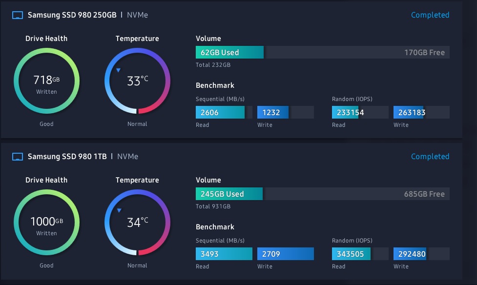 mám problém s rychlostí NVME disků při kopírování dat. Parametrům níže na obrázku se ani nepřiblíží. Pakliže chci kopírovat data o celkové velikosti třeba 5GB, rychlost se pohybuje v nejlepším případě kolem 300MB/s. Ovladače jsou aktuální a kontrola disků nenašla žádný problém. Jinak chod, načítání a samotná svižnost systému je v pořádku. Teploty nepřekračují hranici 45°C. Zbytek sestavy naleznete v popisku. Za každou pomoc budu rád. Děkuji.