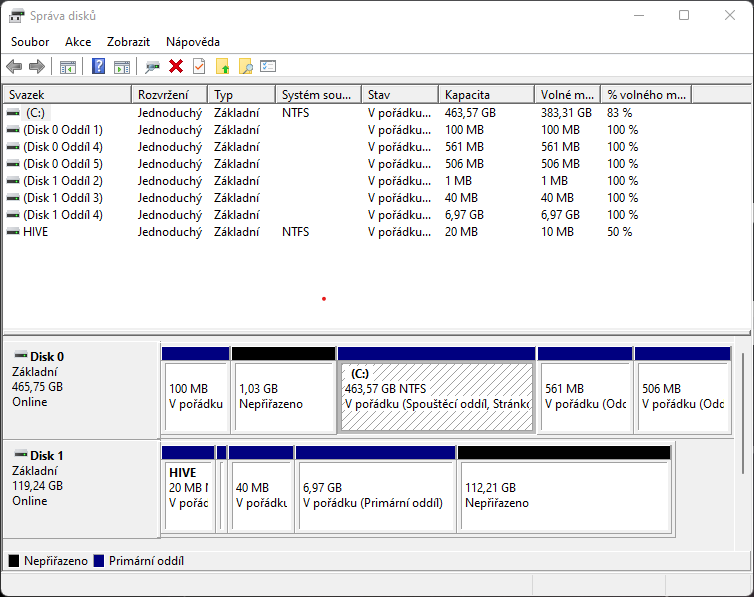 No ja tam vidím "Nepřiřazeno" - tieto oddiely sú ako logické disky a nemajú pridelené písmeno.