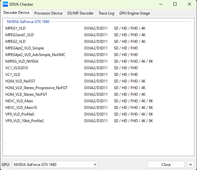 Podívej se ještě na DirectX Video Akceleraci (DXVA), zde odkaz na DXVA Checker: https://bluesky-soft.com/en/DXVAChecker.html