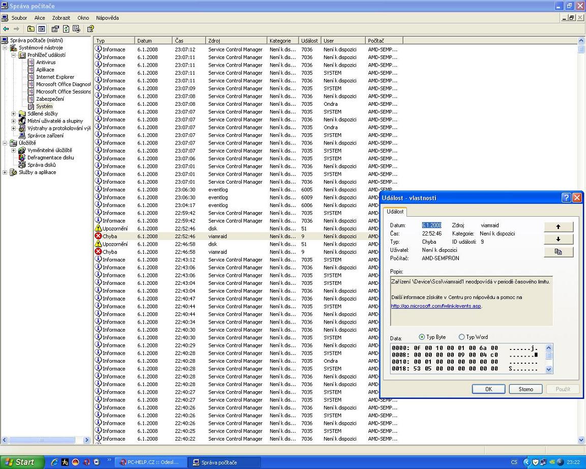 kdyz normalne jsem na pc, tak mi zniceho nic pipne hdd a zastavi se me pc..ale jsem furt ve winu, pak se to rozbehne a po case zas 1x pipne..v prohlizeci udalosti je zobrazen upozorneni DISK a k tomu ve stejny cas chyba: VIAMRAID..