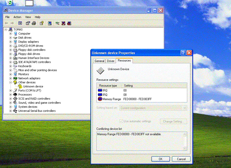 zdravim....v spravcovi zariadeni mi naslo nejaky unknown device ale nejde nijak nainstalovat,v conflict device list je toto :Memory Range FED00000 - FED003FF not available....no a inak mam problem z jednou ramkou a-data 1gb 800mhz ktora vobec nefunguje v ziadnom slote,pocitac hned v uvodnom screene zamrzne...druha ramka funguj bez problemov...pomozte