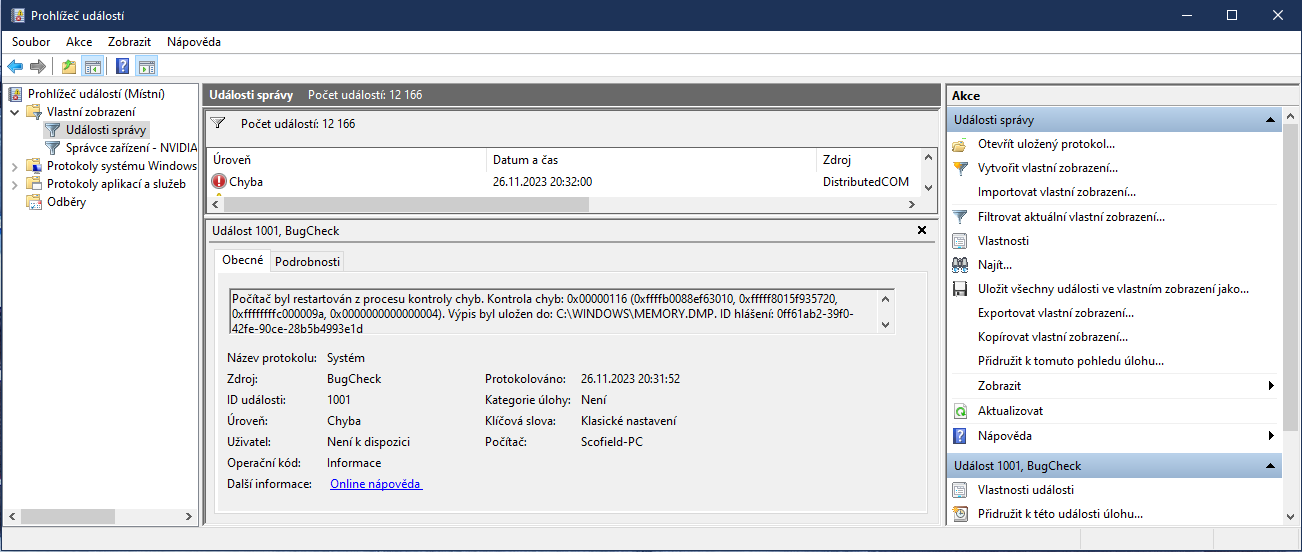 Zdravím, nedávno jsem do PC dal novou grafickou kartu RTX 2060 Super. Při zátěži a dlouhém hraní náročnějších her vše funguje v pohodě, problém nastává v "klidovém režimu" to znamená při prohlížení webu přes prohlížeč a podobně. Prostě z ničeho nic zčerná obraz, sekne se zvuk (pokud zrovna něco hraje) a následně se restartuje počítač. Stane se to každou zhruba hodinku. Podíval jsem se do prohlížeče událostí a byla tam tato chyba: 0x00000116 (0xffffa703044b7010, 0xfffff8045faa5720, 0xffffffffc000009a, 0x0000000000000004)