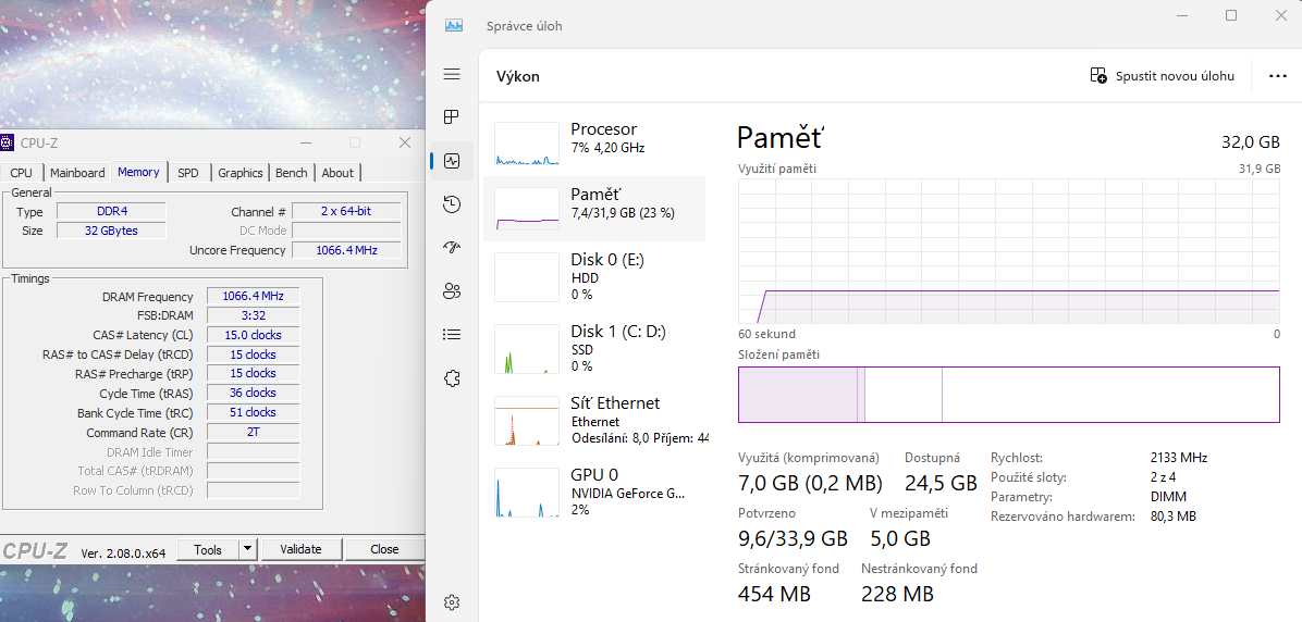 Po zavítání do správce úloh jsem si všiml, že ramky mi běží na 2133 přesto, že jsou nastaveny v biosu na 3600. Nebývalo to tak. Delší dobu jsem nic nehrál, takže jsem si případného zpomalení nevšiml. Viz foto správce, cpuz a biosu.