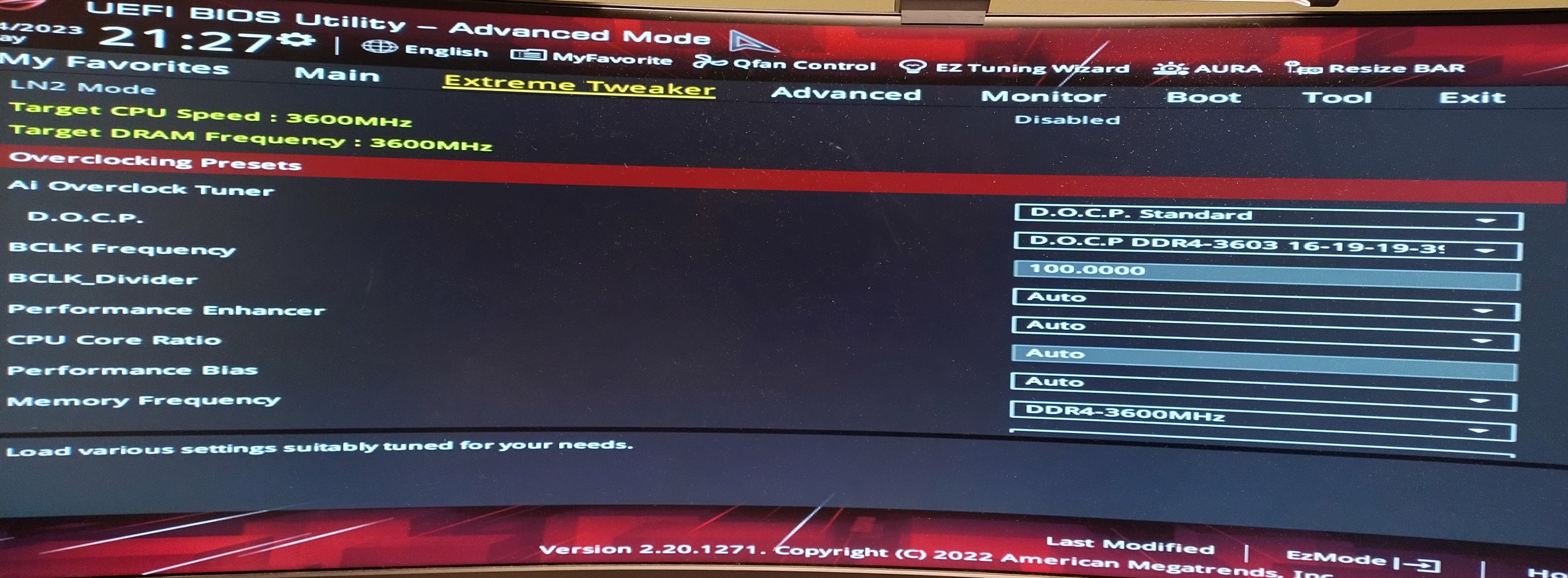Ať už je to jakákoliv ASUS MB, tak nastavuju profil RAM (DOCP, EXPO, XMP) na té úvodní stránce BIOSu (přepíná se klávesou F7 na EZ mode). Tím by se měla nastavit správná frekvence, časování i napětí RAM automaticky. Pokud jen nastavíš 3600MHz pro RAM a nic víc, tak to MB nezkousne a nastaví základní frekvenci.