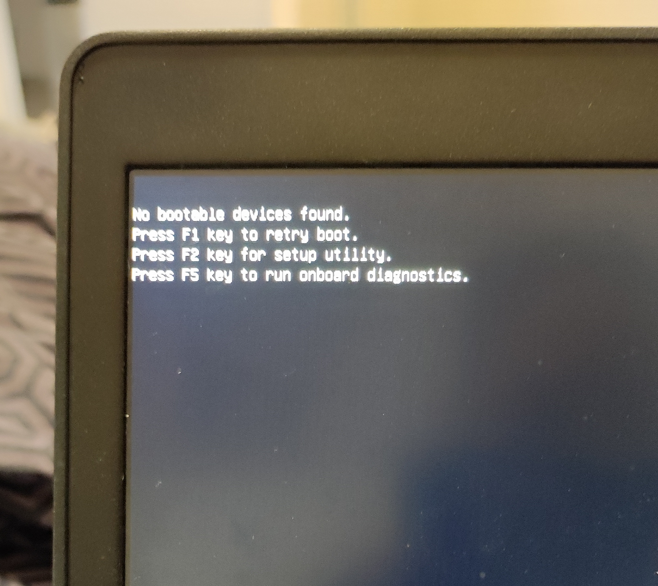 dnes se podařilo naší malé shodit z nočního stolku notebook. Po zapnutí se objeví viz foto. Jenže první možnost vůbec nefunguje, když zmáčknu F2, tak jsem také vyzkoušela všechny možnosti, ale vždy se to vrátí zpět na úvodní obrazovku. Co se s tím dá dělat? Ještě doplním, že mi to hlásí, že není nainstalovaný HDD.